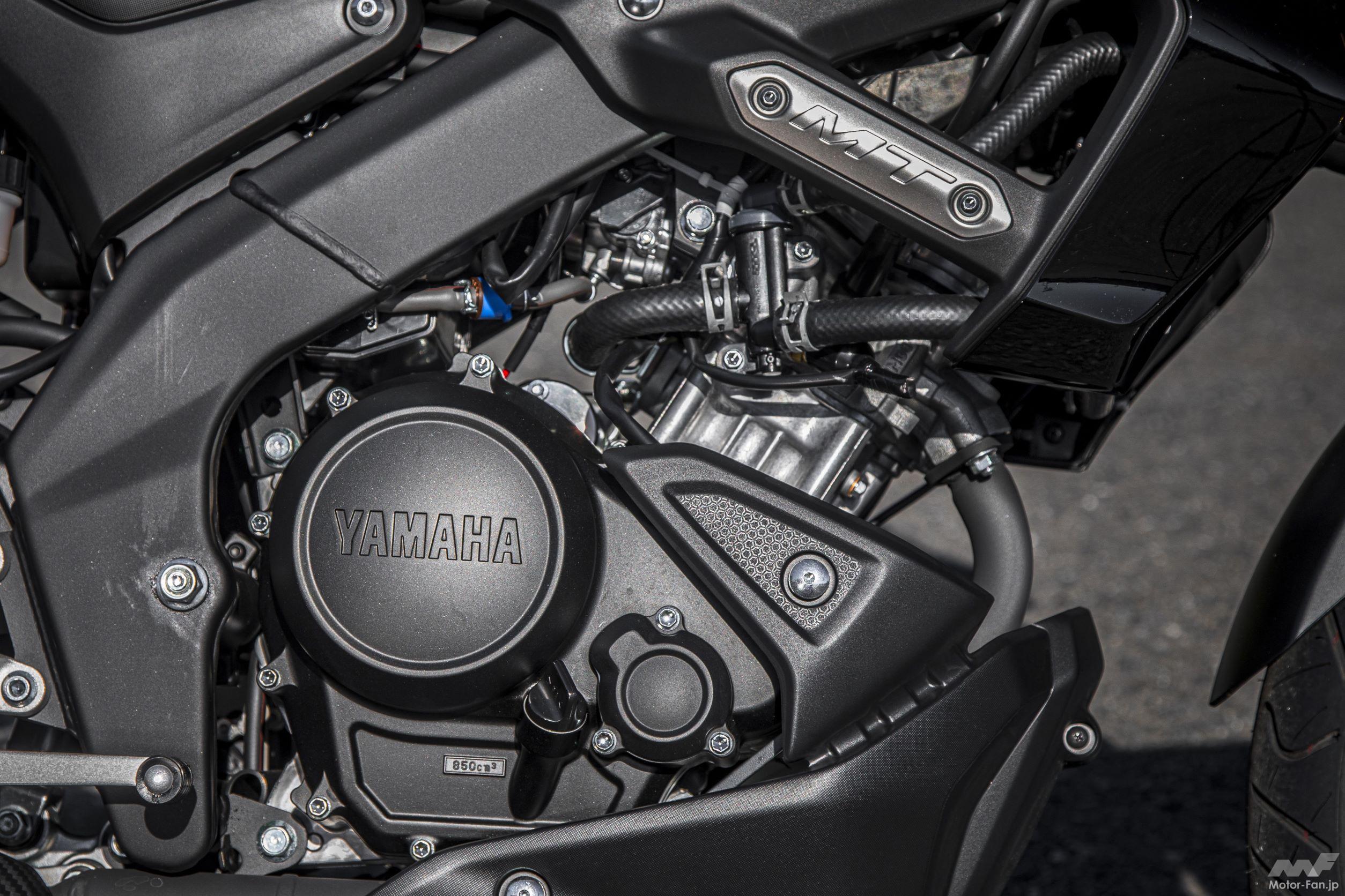 まずはMT-125のエンジンから。形状こと全く異なるものの、ボア×ストローク値(φ52.0×58.7mm)はスクーターのNMAXやシグナス グリファスらが搭載するブルーコアエンジンと共通だ。付け加えると、可変バルブタイミング機構のVVAも採用しており、異なるのはハイカムへの切り替えが6,000rpmではなく7,400rpmということだ。なお、MT-125の最高出力は、EUのA1ライセンスで乗れる上限の11kW(15ps)/10,000rpmとなっている。