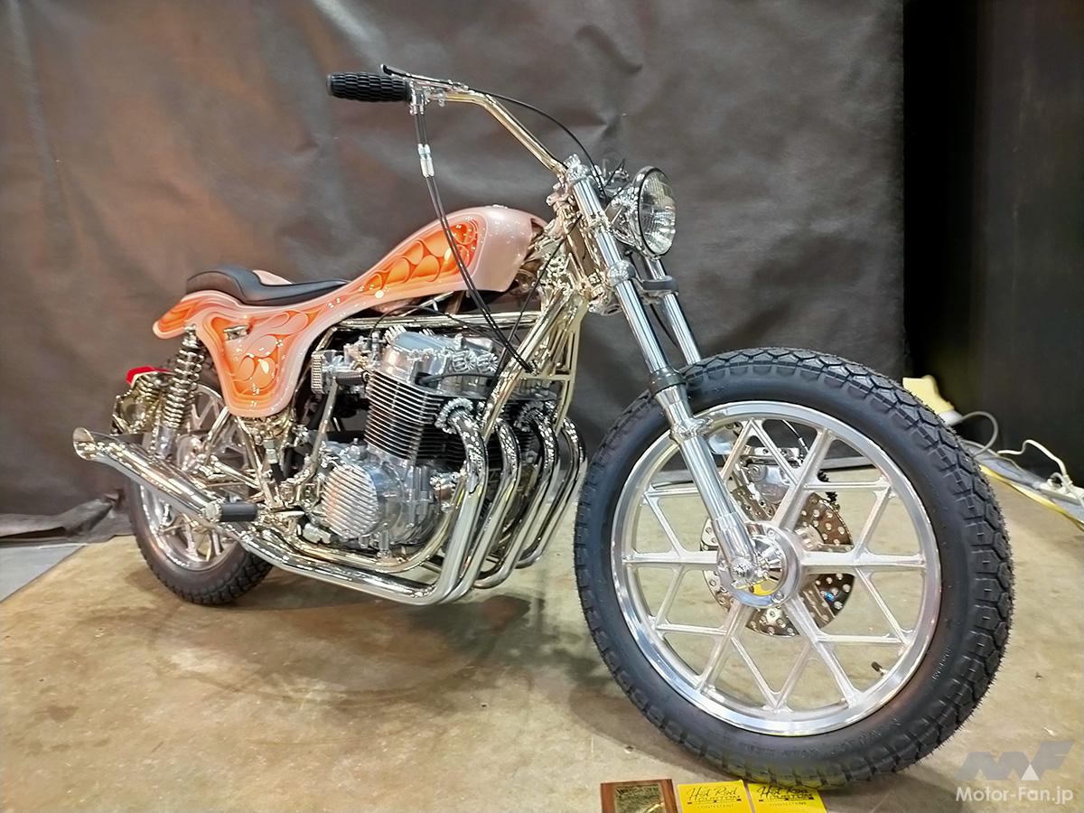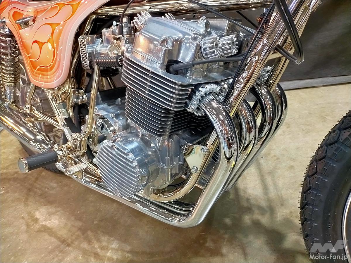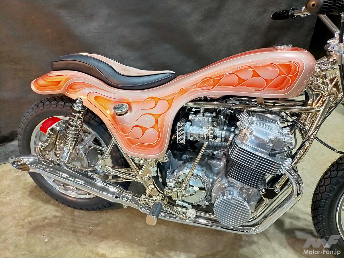 写真のカスタムはCB750FOURをベースに、「これがシービーナナハン?」と思わせる衝撃的なフォルムにアレンジ。製作したのは茨城県のバイクショップ『フジヤモーターサイクルズ』。またオーナーは長きに渡り、チョッパーシーンを牽引し続けてきたバイカーズブランド『EVILACT(イーブルアクト)』の山本港人(ヤマモト・ミナト)氏。
