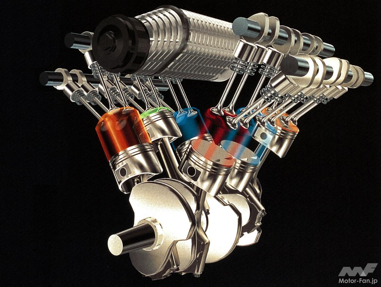 下死点を過ぎ、圧縮行程に入ってから吸気バルブを閉じるということはつまり、筒内の混合気を吸気ポートに押し戻す格好になる。コレクタータンクまでそれが届いてしまうと、空燃比が狂ってしまう。その戻り分を加味して吸気管設計を施す必要があり、ご覧のように吸気ポートは長くなった。非常に立った設計なのは、バンク内に過給機(スーパーチャージャー)を収めるため。