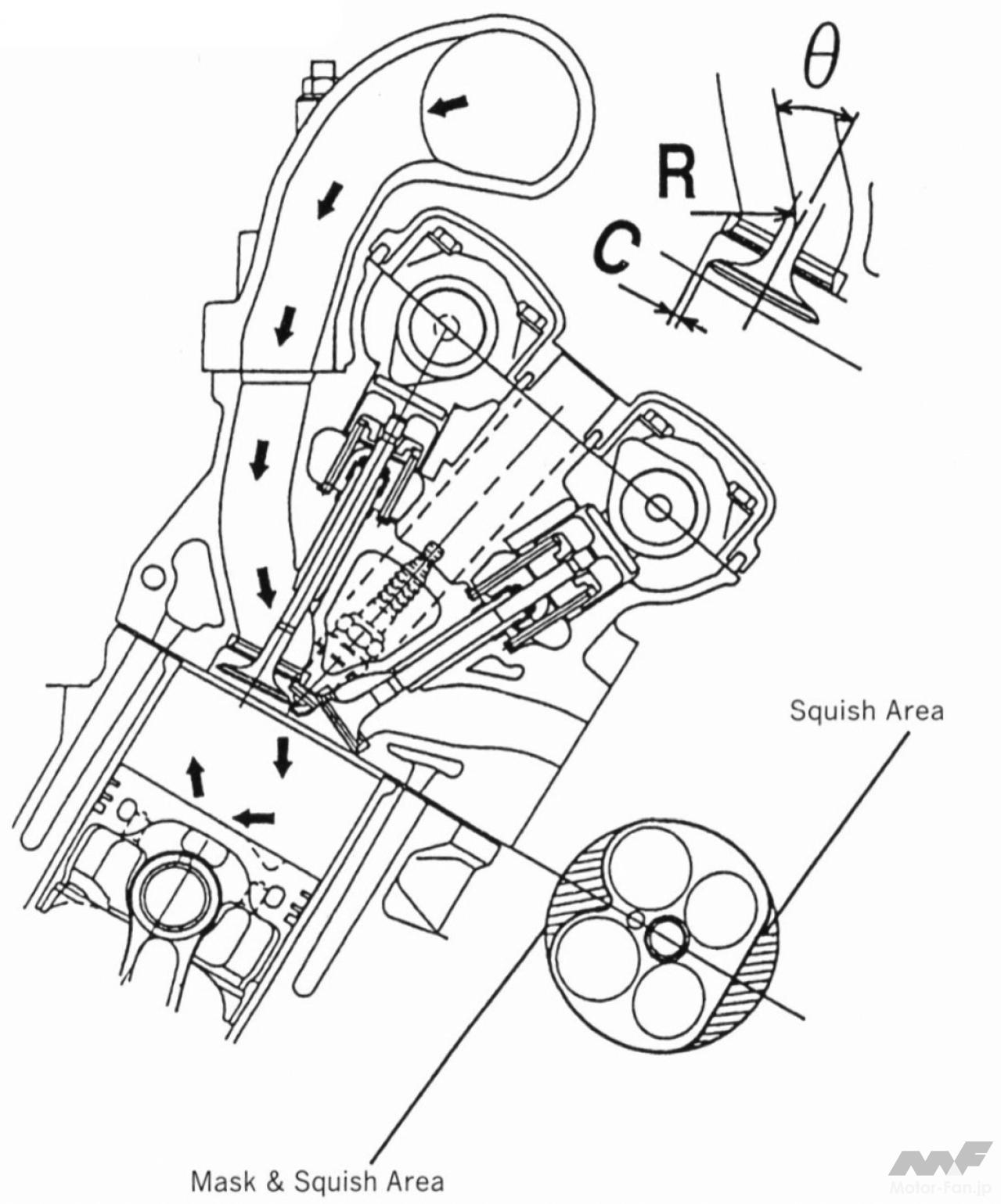 急速燃焼を図るために筒内にはタンブルを起こしたい。しかし縦渦を強くしすぎると今度は早期効率が落ちてしまうことが判明した。双方を満足させるためにとった手段がポートの絞りと燃焼室に設けたマスクだった。