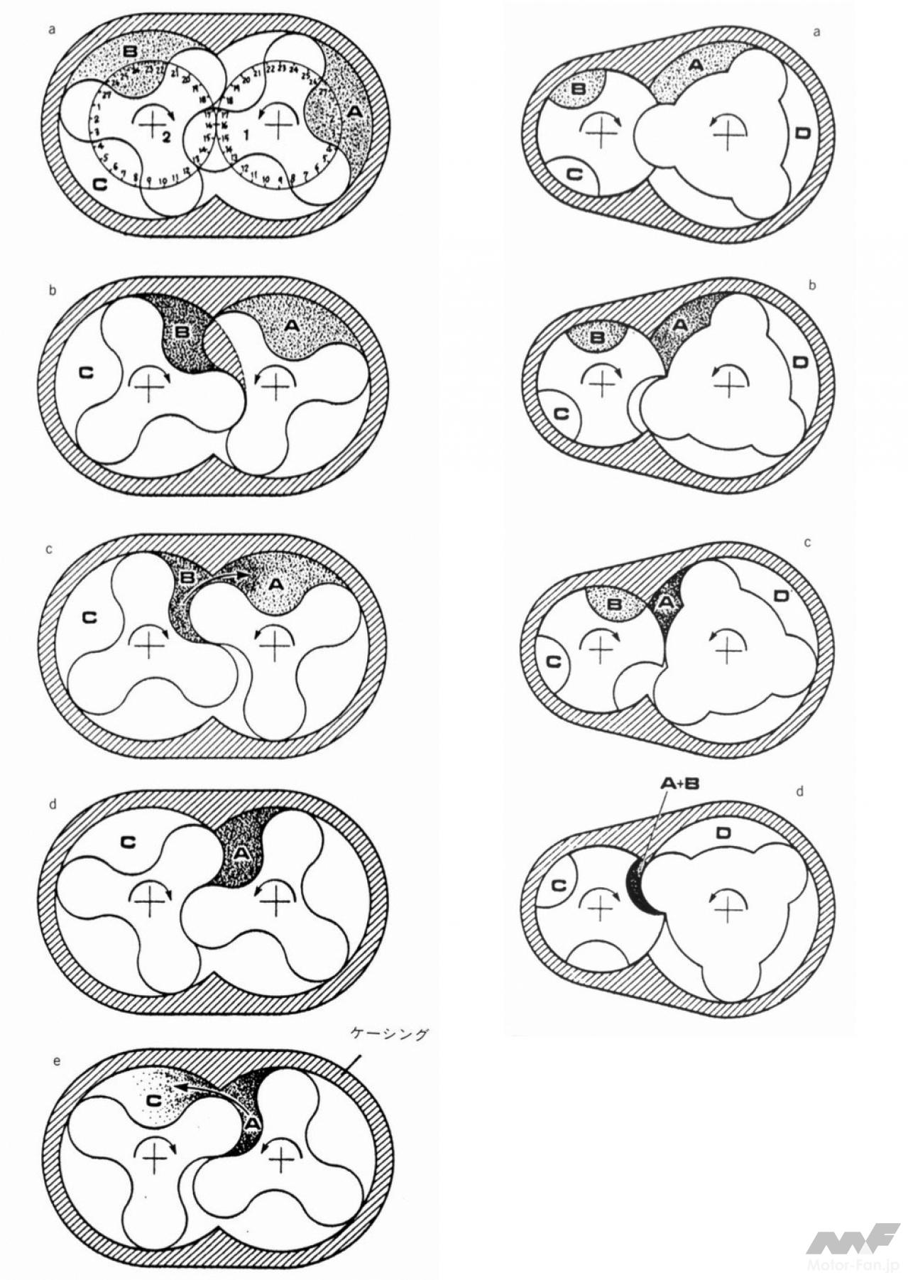 左aに示すAエリアとBエリアの推移を見ていくと、左bではBエリアが圧縮されていき、左cではAエリアと連通、左dではそれがさらに圧縮されていき——と思えるが、左eの状態でCエリアと再び連通、圧力が戻ってしまう。つまり、ルーツ式では圧縮が高まったり低くなったりを繰り返すだけで、つまり吸気の温度が高まってしまうことにもつながる。ならばケース側に漏れない構造にすればばいい。それを検討したのが右列である。兼坂氏はここからさらに検討を進め、雄3葉/雌5葉の見慣れた形状にたどり着いている。
