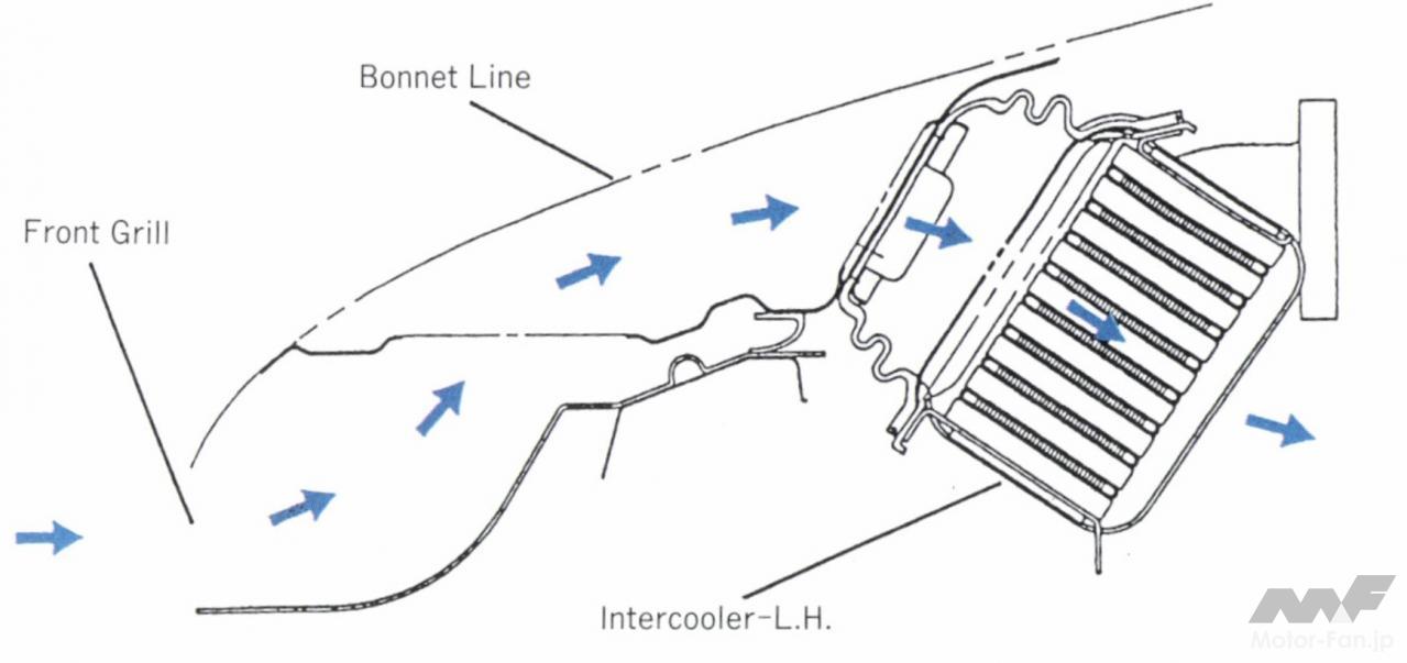 圧縮された空気は温度が高くなるため、冷却したい。KJ-ZEM型は先述のように冷凍サイクルが見込めない遅閉じミラーサイクルだったことから、なお吸気冷却システムが必要。そこで、左右バンク毎にインタークーラーを備えていた。左側のインタークーラーが高さを持ってしまったためどうにもエンジンルームに収まりそうになく、そのため意匠部門と相談してボンネット高さを変更してもらったと、設計者の畑村耕一博士は当時を振り返っている。