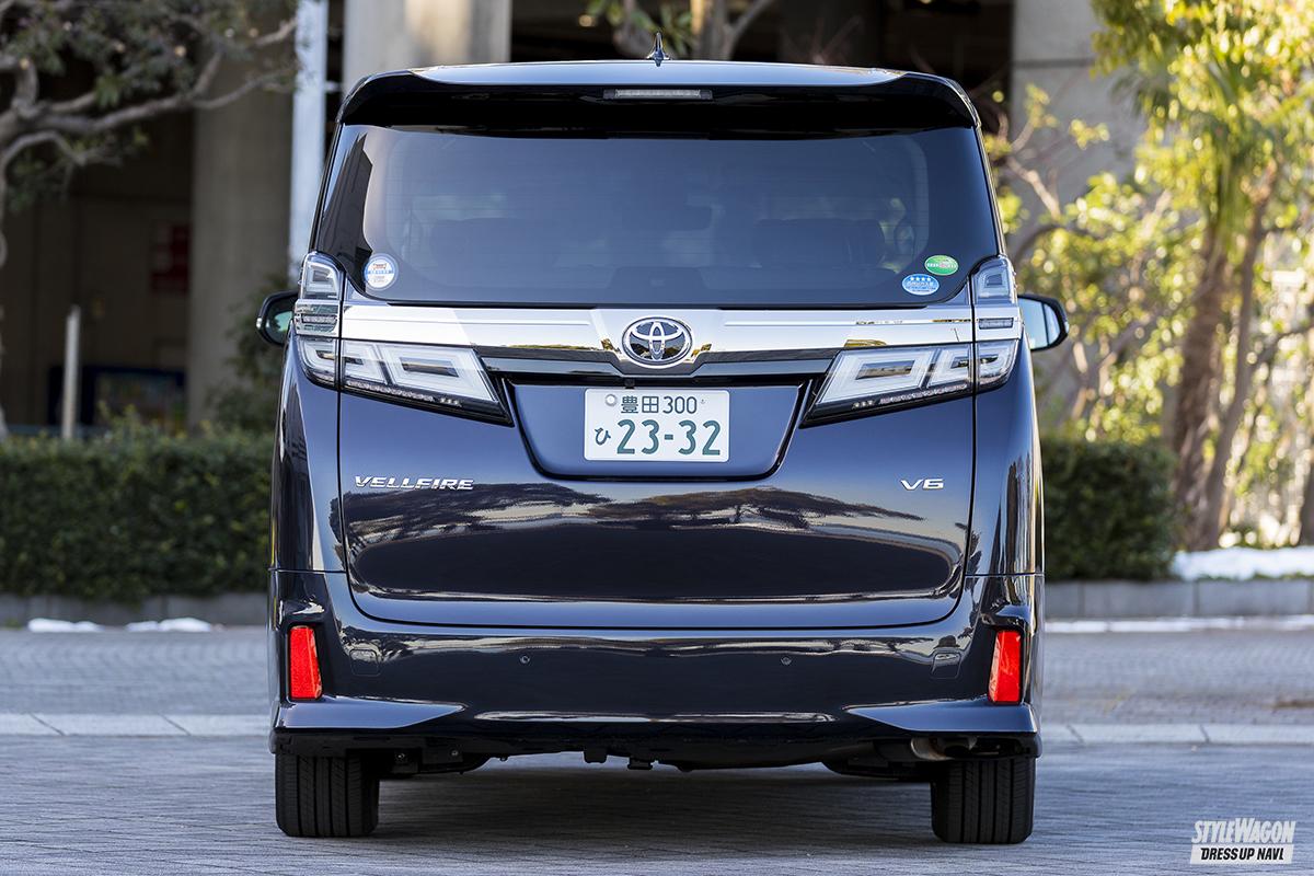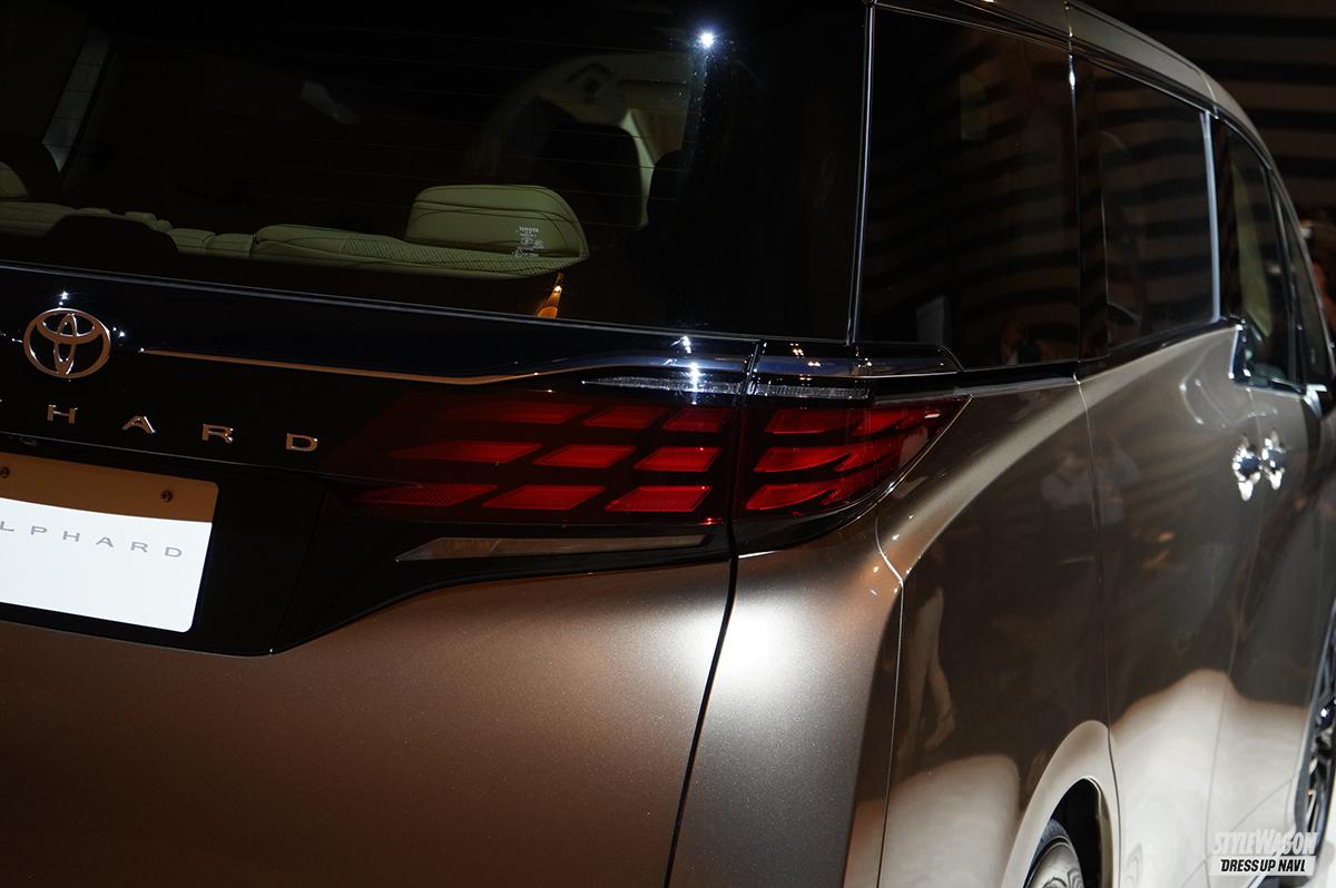 「これカスタムパーツですか?」と思わず質問しそうになるほど、近未来的にアップデートされたLEDランプ。その違いは30系のリアビューと比較すれば一目瞭然だが、ディテールへのこだわり感がとにかくすごい。アルファードに関しては、シームレスにLEDの光が浮かび上がるように点灯し、しかもそれぞれくっきりと光るので後続車化からの視認性は抜群に高いと思われる。一方ヴェルファイアに関しても、30系は一文字のメッキガーニッシュが存在感を放っていたが、今回はLEDの光が一文字に光る仕様に変更されている。後ろから見ても、新型アルファード&ヴェルファイアの存在感は強烈だ。