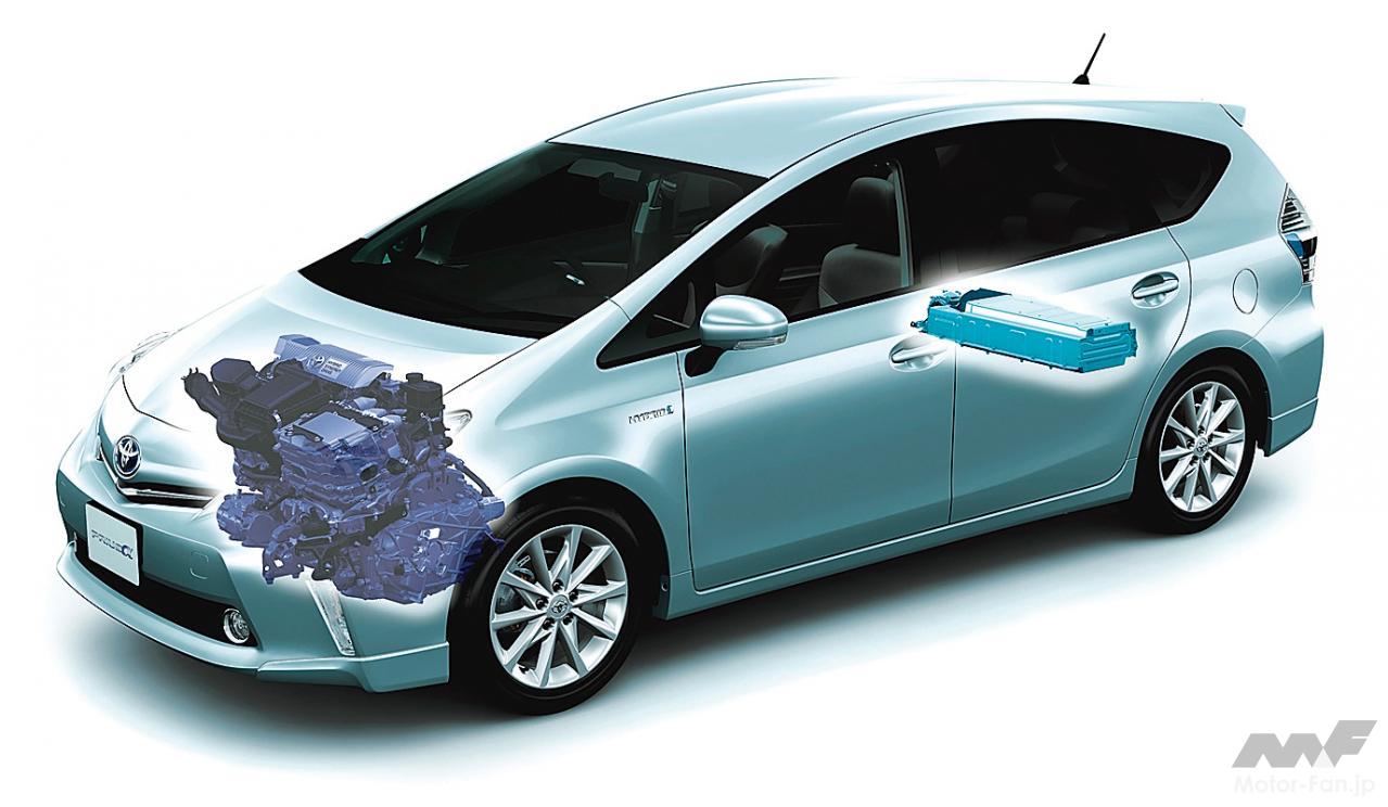 プリウスαは2列シートの5人乗り仕様と3列シートの7人乗り仕様がラインアップされ、それぞれにバッテリーパックの搭載位置が異なっている。5人乗り仕様は3代目プリウスと同じパックを同じような位置に搭載しているが、その位置では3列目シートを作り付けることができない。そこで7人乗り仕様はエネルギー密度が高く小型化が可能なリチウムイオン電池を採用したバッテリーパックを初採用し、前席左右の間に搭載している。