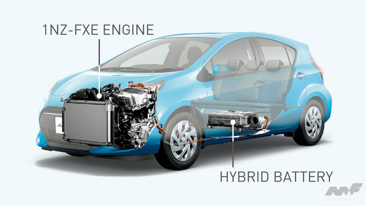 アクアのフロアパネルはヴィッツ用を基本とし、HEV化に必要な改良を加えたものだ。言葉を変えると、海外に輸出しているヤリス・ハイブリッド用と共用している。センターフロアパンとクロスメンバーを新設定し、燃料タンクとバッテリーを配置するスペースを確保。燃料タンク前方、後席座面下側にバッテリーパックと補機類用バッテリーを置いている。今後、リチウムイオン採用でパックの小型化が進めば、この構成が主流となるかもしれない。