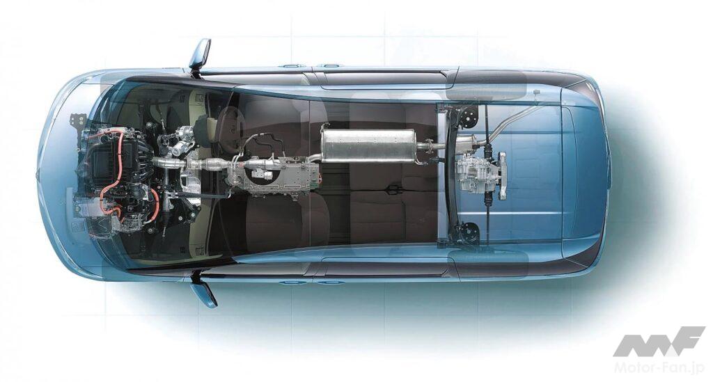 2代目モデルから横置きFFとなり、HEV仕様も設定。前輪にはプリウスなどと同機軸の減速機構付きTHSを搭載しているが、後輪の駆動はジェネレーター兼モーターのみで行なう「E-Four」システムの採用が特徴。走行状況に応じて後輪に駆動力を与えることでスタビリティレベルを確保することが主な目的だ。プラットフォームの基本を共用するアルファード/ヴェルファイアHEVも同様のシステム。バッテリーはセンターコンソール位置に搭載する。
