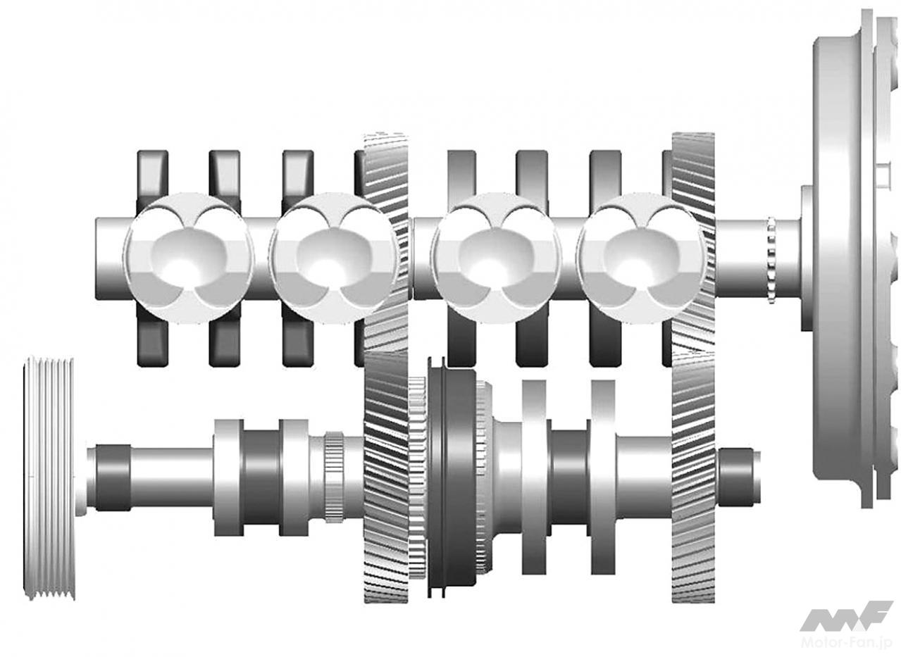 アイドリングと発進は2気筒で行なわれる。2気筒にすることでアイドリング時のフリクショントルクは約4Nm減るそうだ。トルクが必要になったら、クランク軸と平行に位置した軸の中央にあるクラッチをつないで4気筒運転に入る。詳細は不明だが、おそらく、排気量を半減させて高負荷域を使い、燃費の悪い領域を避けるねらいだろうか。6000rpmで2気筒運転すれば、フリクショントルクは4気筒比で約6Nm小さくなる。想定しているのはガソリン直噴NAエンジンだという。