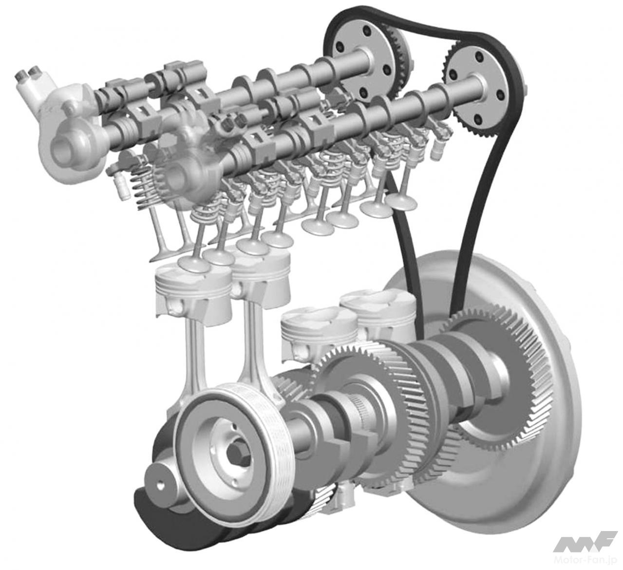 興味深いのは、2気筒ずつのクランク位相が同じ点である。2気筒そろって上下する。点火は360°位相になるが、機械運動としてはアンバランス成分が出やすいだろう。また、スライドカムを採用し、リフトは2~3段階に切り替えられる。いままでに見たことのない独創的な気筒休止エンジンだが、IAVに50%を出資する大株主はVWであり、もしかしたら……という思いも頭をよぎる。ぜひとも実物を拝見してみたいエンジンである。