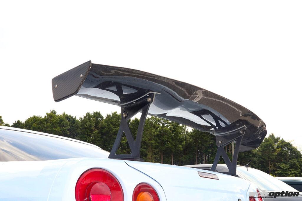 全身に渡って施されたカスタマイズの中でも、まず目を引くのはエクステリア。R仕様のフロントセクションはドゥーラックのバンパー、高瀬スタウトのカーボンボンネットで構築。サイドはインパル、リヤバンパーはR34GT-R純正で、GTウイングはサードとミックスエアロでオリジナルスタイルを実現。ボディカラーは、レクサスのクォーツホワイトクリスタルシャインだ。