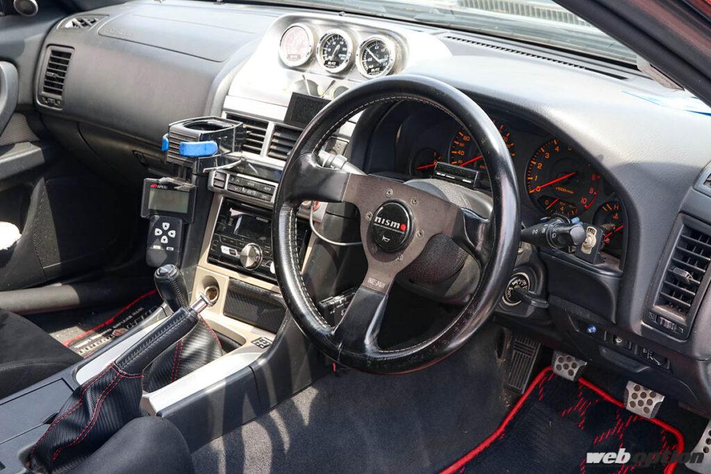 インテリアのコンディションも上々で、日々のオーナーの愛着ぶりが現れている印象。ステアリングはニスモで、左右のシートもブリッドのバケットタイプに変更。センターコーンソールにはエンジンマネージメントを司るアペックス・パワーFCのコマンダーも確認できる。