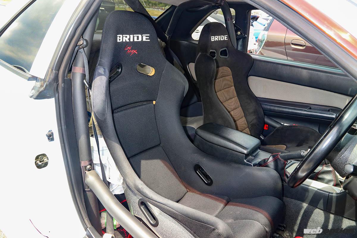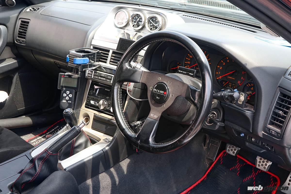 インテリアのコンディションも上々で、日々のオーナーの愛着ぶりが現れている印象。ステアリングはニスモで、左右のシートもブリッドのバケットタイプに変更。センターコーンソールにはエンジンマネージメントを司るアペックス・パワーFCのコマンダーも確認できる。