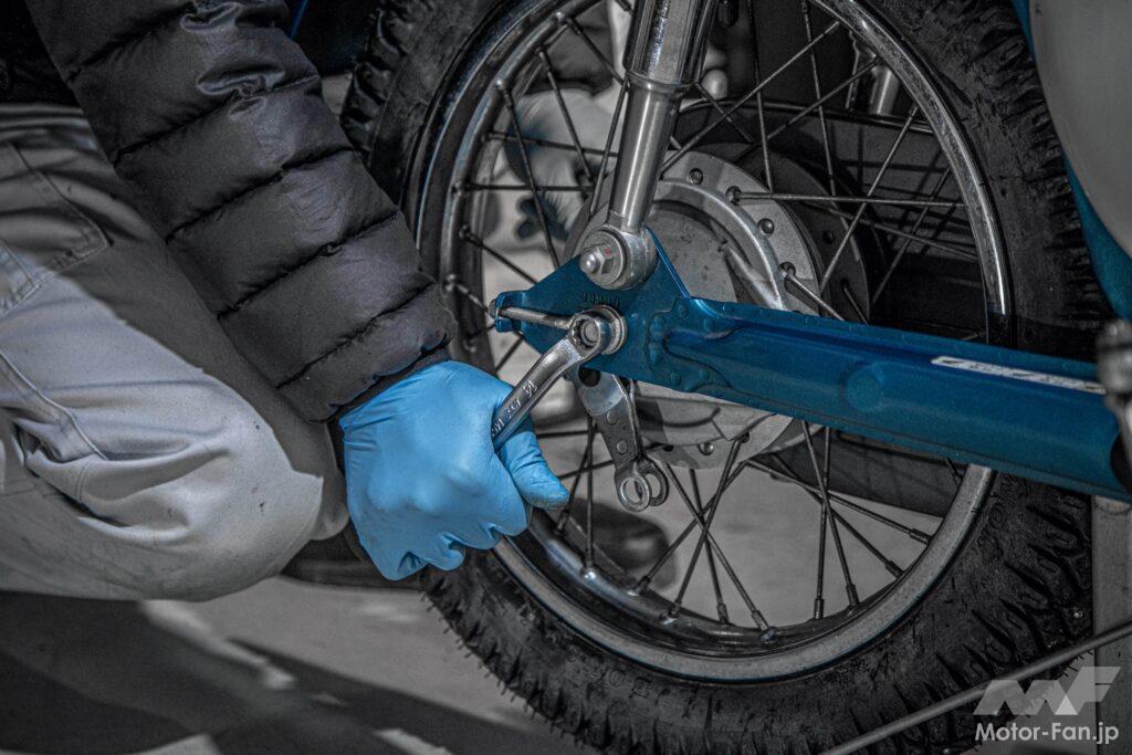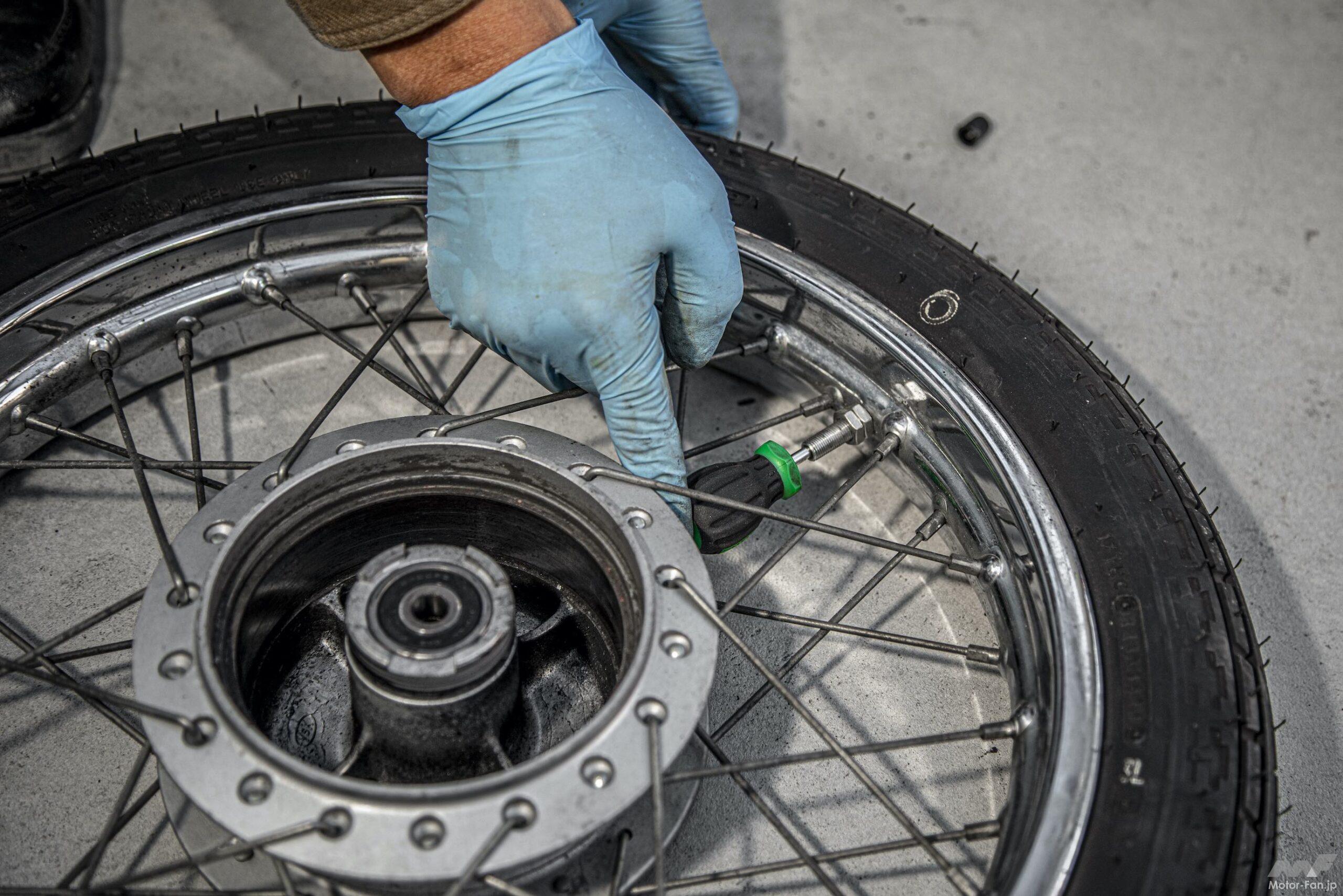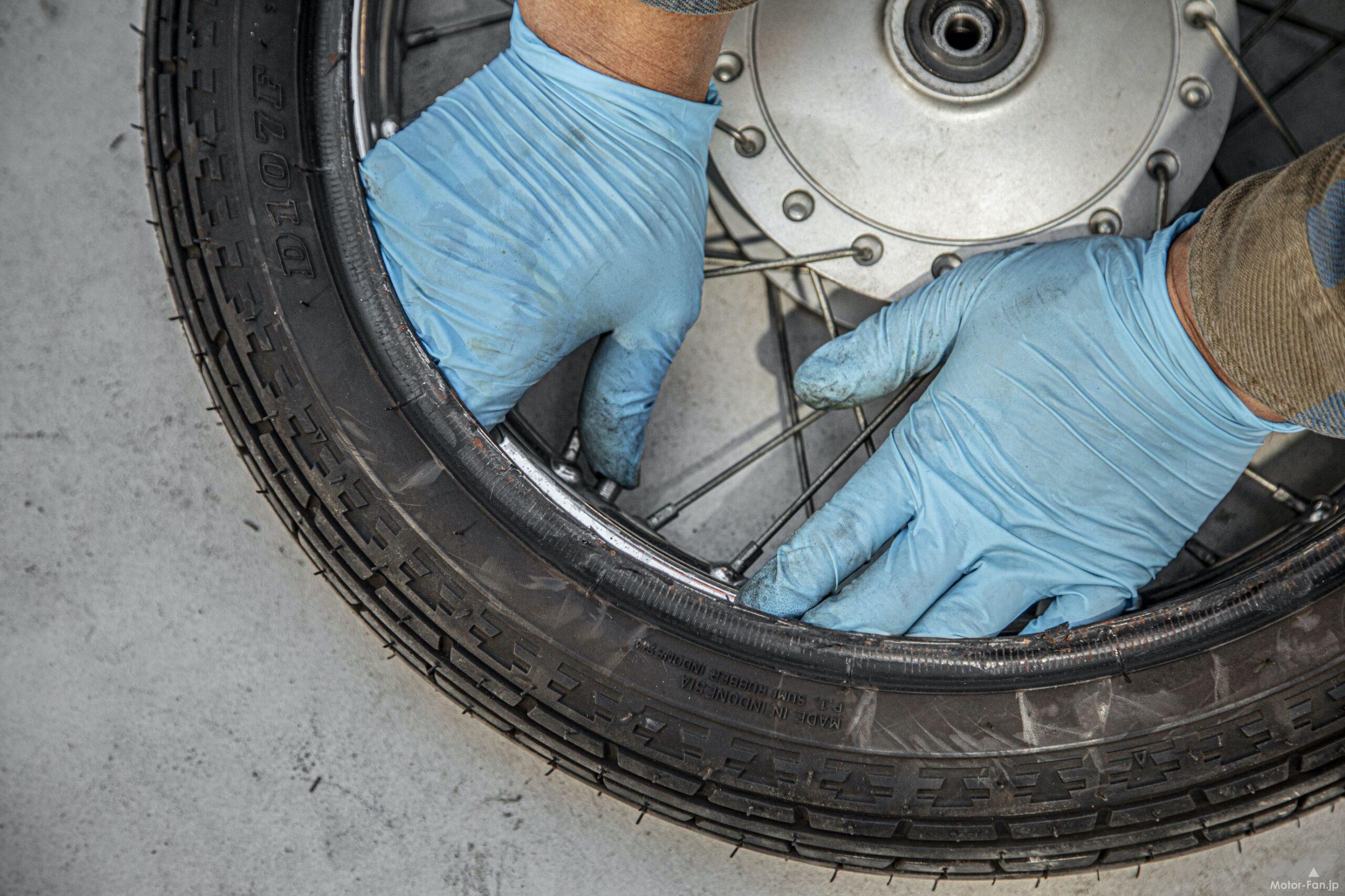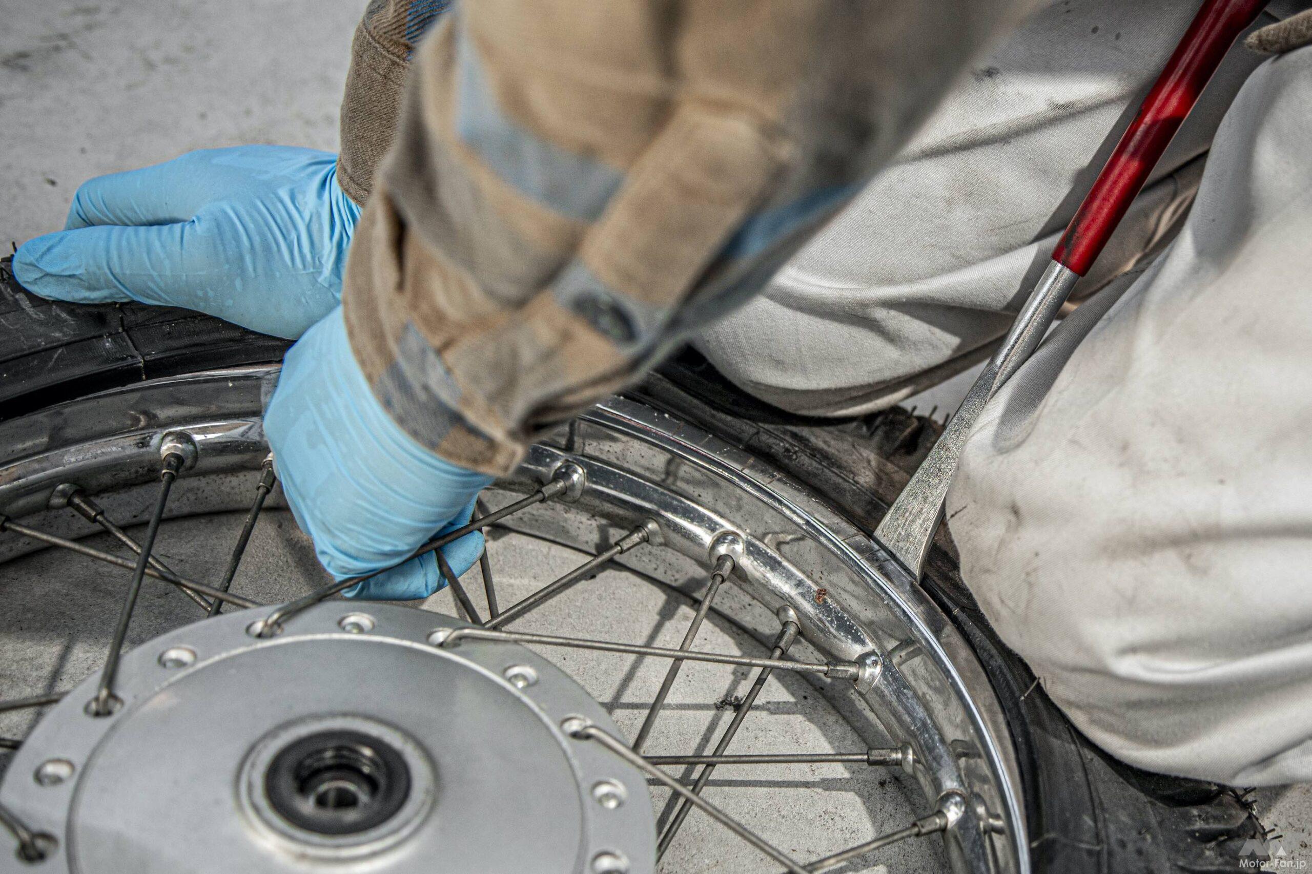 二人で作業したのはリトルカブとスーパーカブの2台ともタイヤ交換をしたから。一人がフロントタイヤを交換しつつ、その様子と撮影。残りの一人が残りのリヤタイヤを交換するという流れだ。前述のようにフロントタイヤを交換する模様を撮影しながら、残りの一人がリヤタイヤを交換していた。ここで事件が起こる。