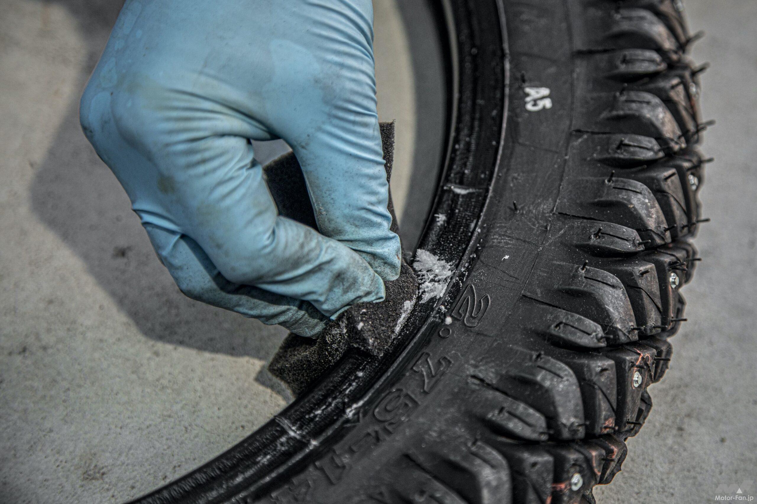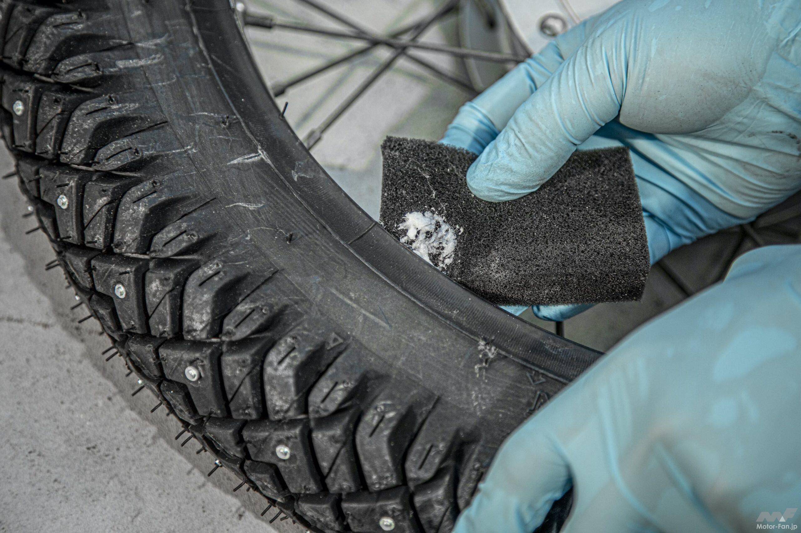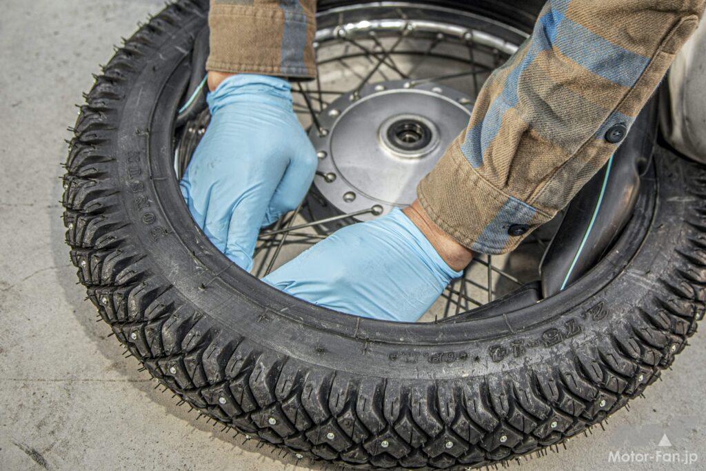 実はこの作業が一番大変かもしれないのが、エアバルブをリムの穴に通すこと。このスパイクタイヤはなぜだかビードが硬くて指を入れづらいことから、何度も試してうまくハマらず挫折しそうになったことを白状しよう。エアバルブを穴へ通す時はチューブ全周をタイヤ内へ入れる前に行うこと。またこのタイヤにはなかったが、タイヤのサイドウォールに軽点マークと呼ばれる丸い印があることがある。この印をエアバルブと合わせることでタイヤのバランスが取れることになる。