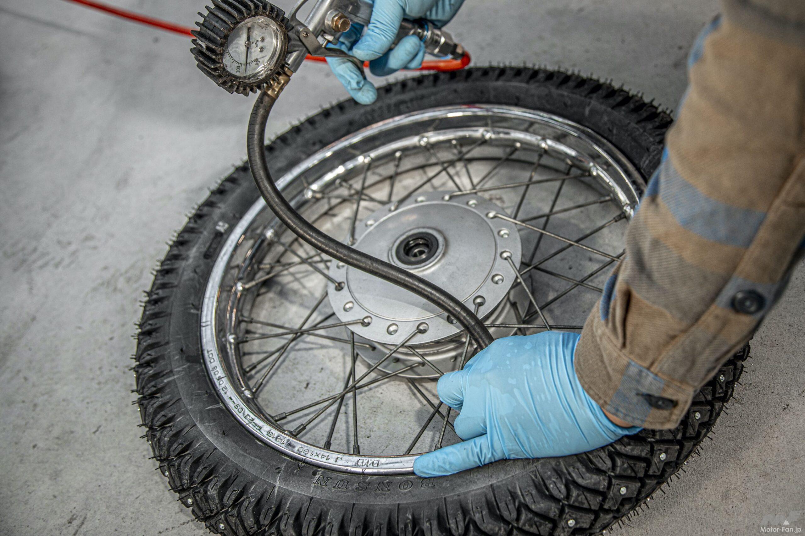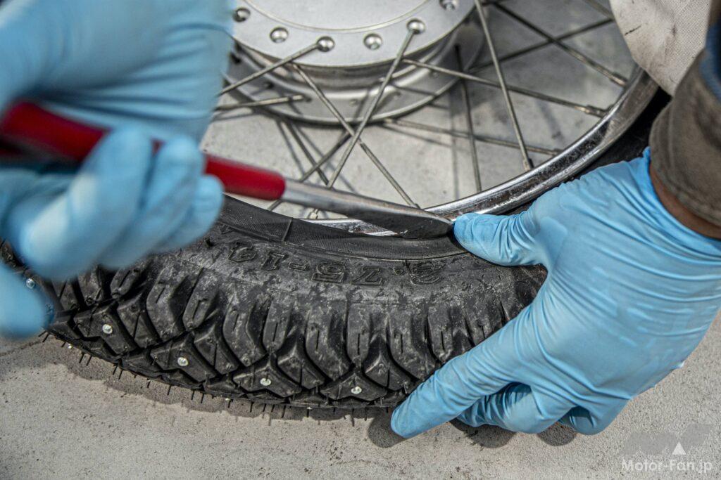 リヤタイヤを外すのに手こずり、フロントタイヤを交換し終えた時もまだ作業中。そこで二人で作業してようやく外れた。さらに新品のスパイクタイヤを組み込んだところ、なんとエアを入れるとシューっと音がする。チューブを傷つけてしまったのだ。また同じ作業を繰り返して元のチューブを組んでみたところ、こちらもシューっと音がしてパンクしていることが発覚。この時すでに夕方近くになり、そろそろ陽が落ちる。残りの撮影を考えてリトルカブのリヤタイヤはサイクルショップでパンク修理してもらうことにした。
