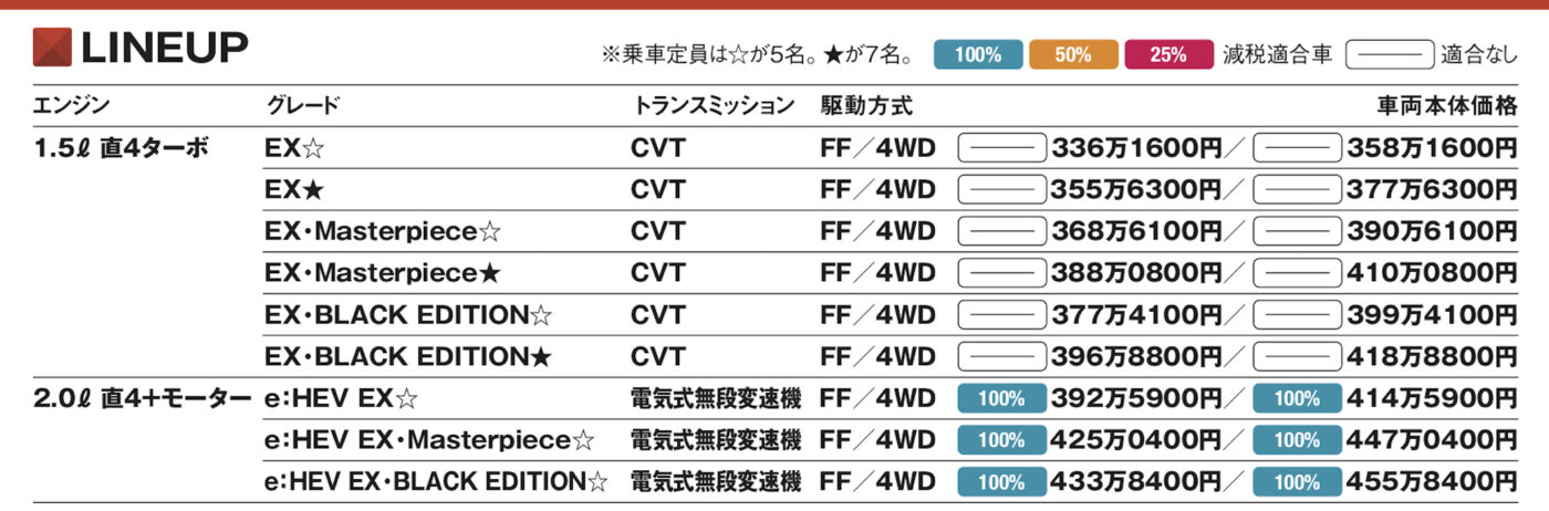 パワートレーンは1.5l直噴ターボ+CVTと2.0lエンジン搭載のハイブリッドであるe:HEVの2種類。ガソリン車はそれなりに低回転域のトルクが充実しているので1630kgの車両重量に対して不満を覚えるほどではないものの、やはりモーター駆動のe:HEVの方が動力性能に余裕があり、静かで滑らかなフィーリングは圧倒的だ。