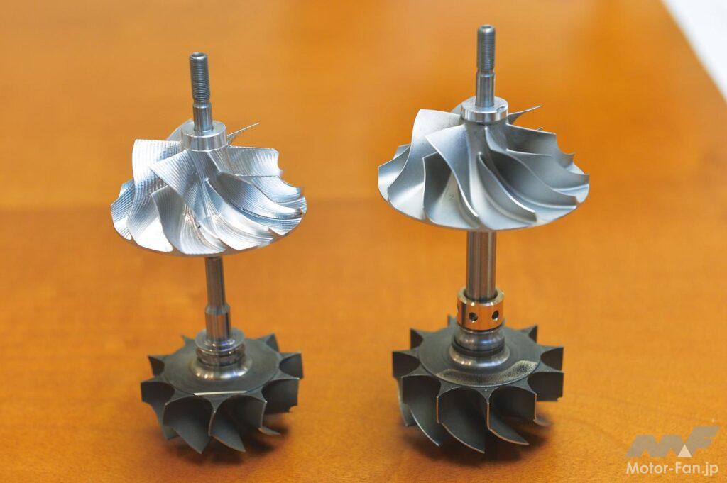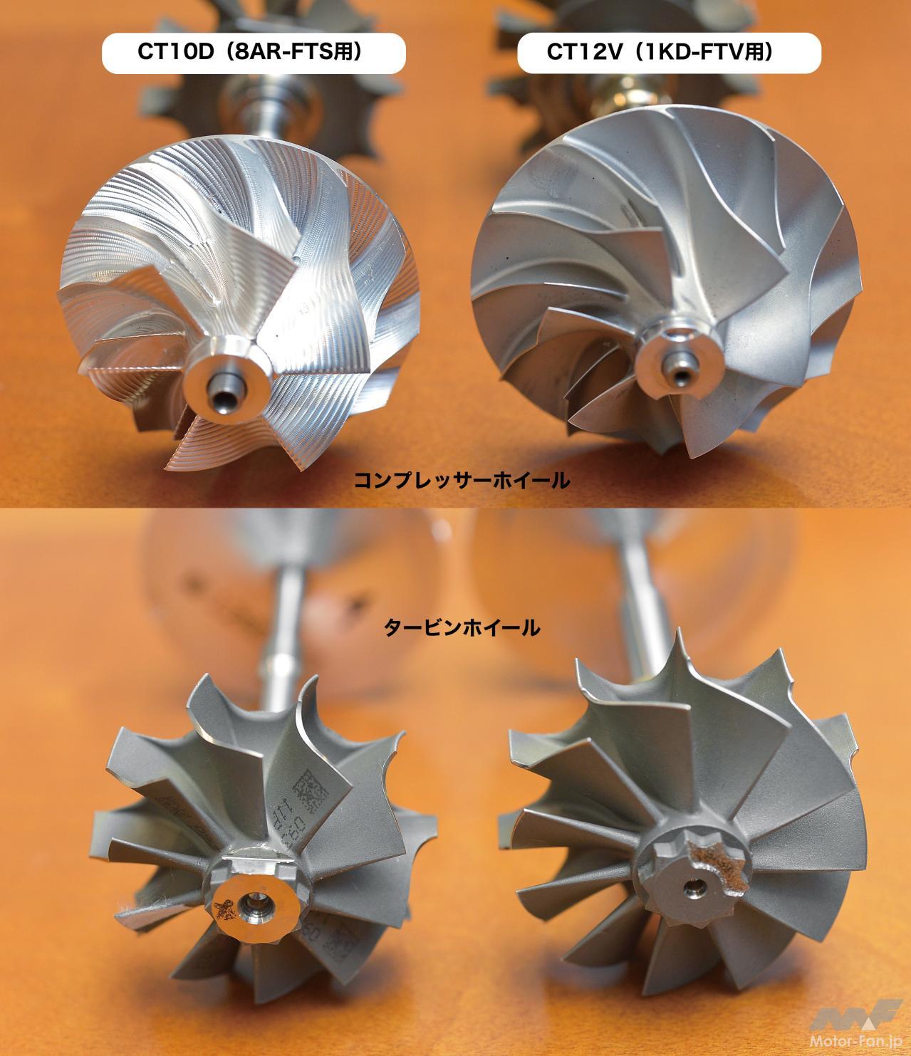 第3世代の1KD用と第4世代の8AR用を比較すると、コンプレッサー側(上)は切削加工である点が新しい。トヨタは新ディーゼルGD用のT/Cも切削加工に切り替えた。もっとも薄い部分は肉厚0.6mmという精密加工である。タービンホイール側(下)も翼形状が微妙に異なる。これは排気通路(スクロール)との関係もあるが、流体解析と設計シミュレーションの進化が形状を変えた。その形状をいかに製品に転写するかが生産技術である。トヨタがT/Cを内製する理由は設計の最適化であり、それを実現できる生産技術の裏打ちがあってこそ、である。