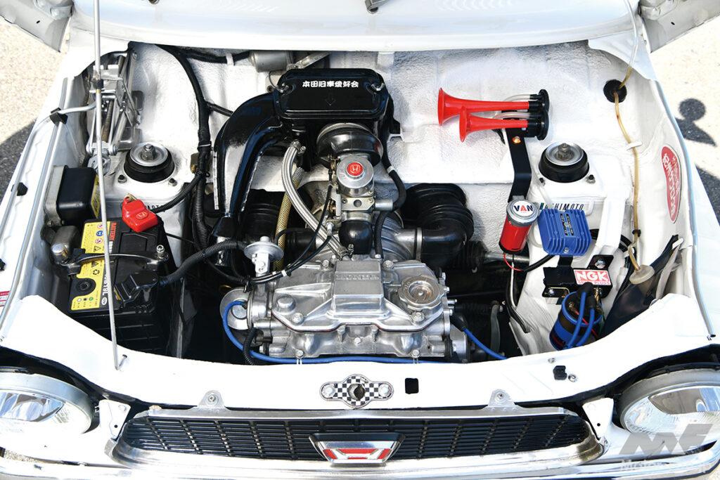 ハーネスを束ねてスッキリさせたエンジンルーム。エンジン本体はノーマルでエアクリーナーも純正を使っている。
