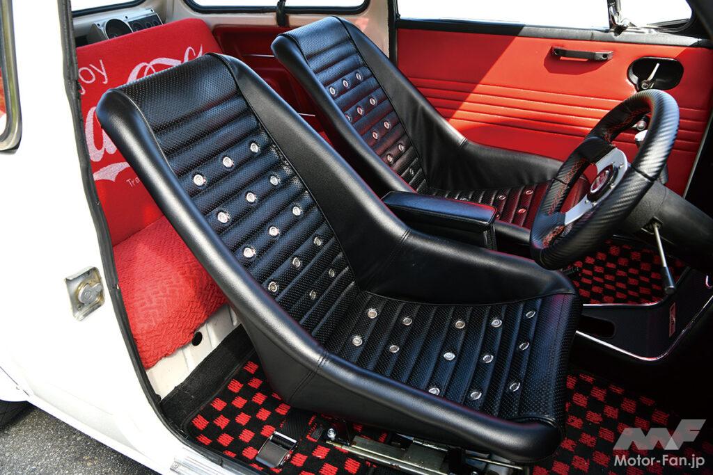 全塗装する前にローダウン。フロントはバネカット、リヤはリーフ反転とブロックでダウン。さらにワイドタイヤを履かせるため選んだのは旧ミニ用のオーバーフェンダー。都合4セットほど買って組み合わせを考え、ミニとは前後逆に装着して納得できた。さらにワゴンR用のリヤバンパーをカットして、自らフロントリップを製作。ここから全塗装に出した。