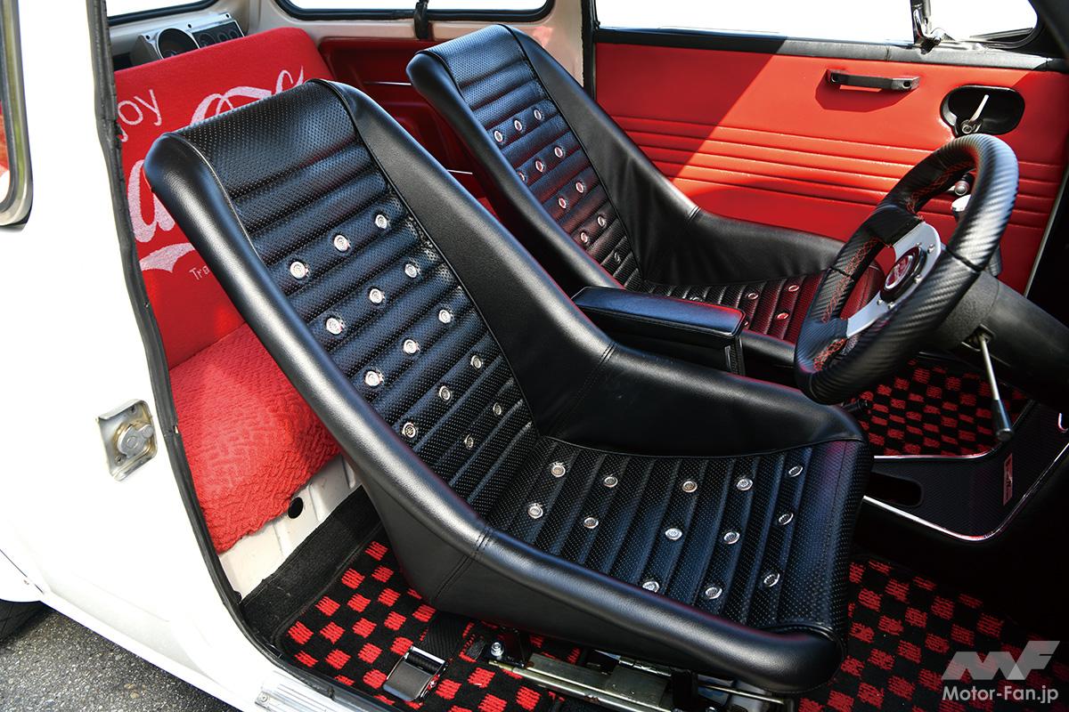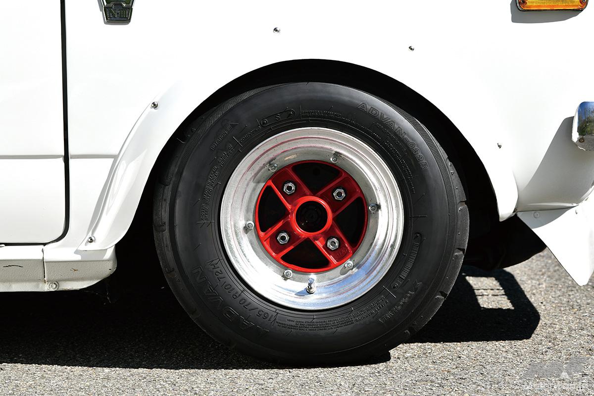 全塗装する前にローダウン。フロントはバネカット、リヤはリーフ反転とブロックでダウン。さらにワイドタイヤを履かせるため選んだのは旧ミニ用のオーバーフェンダー。都合4セットほど買って組み合わせを考え、ミニとは前後逆に装着して納得できた。さらにワゴンR用のリヤバンパーをカットして、自らフロントリップを製作。ここから全塗装に出した。