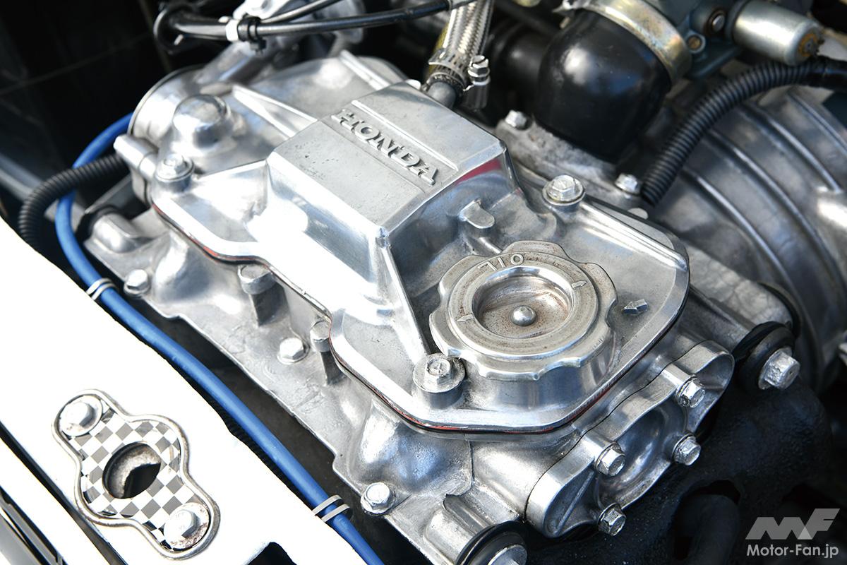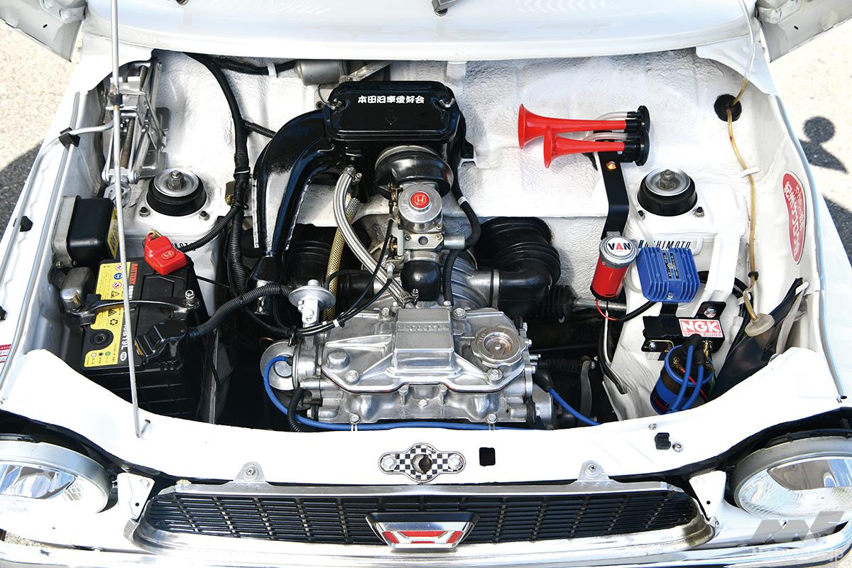 ハーネスを束ねてスッキリさせたエンジンルーム。エンジン本体はノーマルでエアクリーナーも純正を使っている。