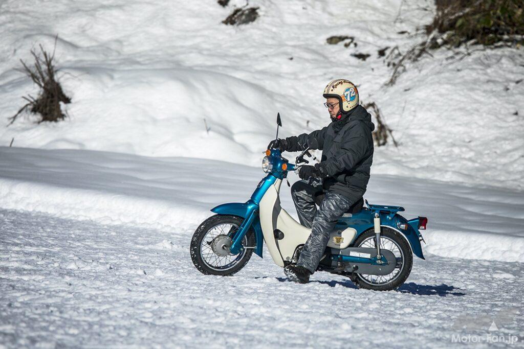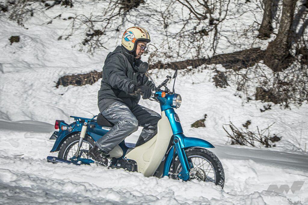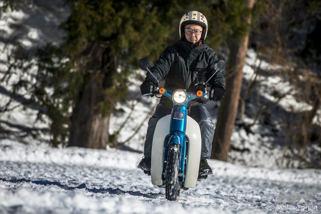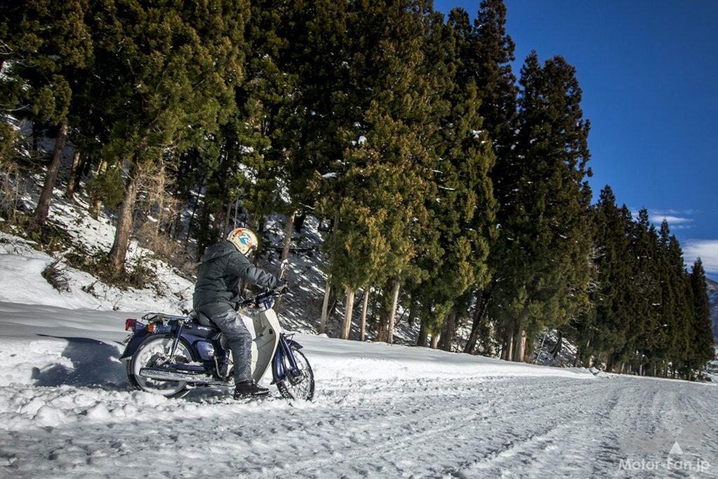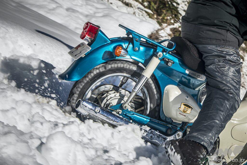 凸凹の圧雪路でこれだけ走ることができるのだから、アイスバーン以外は問題なく走行できることが確かめられた。気温が氷点下まで下がり圧雪が凍り出すとさらなる試練が待っていることだろうが、テスト日のような状況なら運転が大いに楽しめることも発見だった。もう数時間走っていれば、さらにリヤをスライドさせて向きを変える醍醐味とテクニックを習得できたことだろう。思いのほか雪の上を走ることが楽しく、気がつけば想像以上に時間が過ぎていた次第。ただ、刻々と状況が変わる一般道では楽しんでばかりいられないことも事実。とはいえスパイクタイヤを履いたリトルカブなら自信を持って走り抜けられることが確認できた!