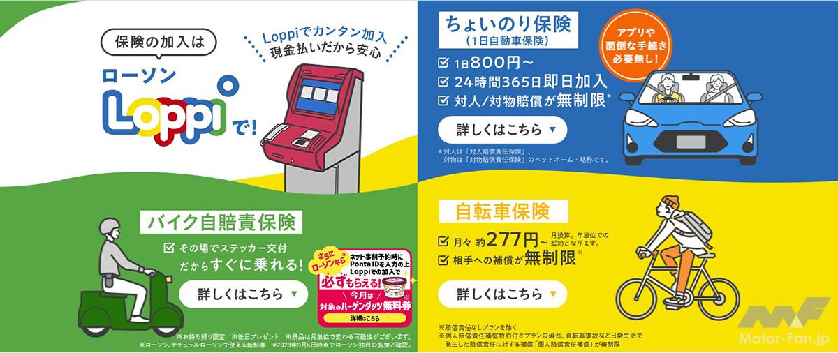 家族や友達など、“自分以外の名義”の自動車を借りて運転する時に重宝するのが、1日(24時間)単位で加入できる任意保険。ローソンとファミリーマートでは「ちょいのり保険」、セブンイレブンイレブンでは「1DAY保険」の名称でサービスを展開中。加入は店舗にある専用機やマルチコピー機を使用するシステム。