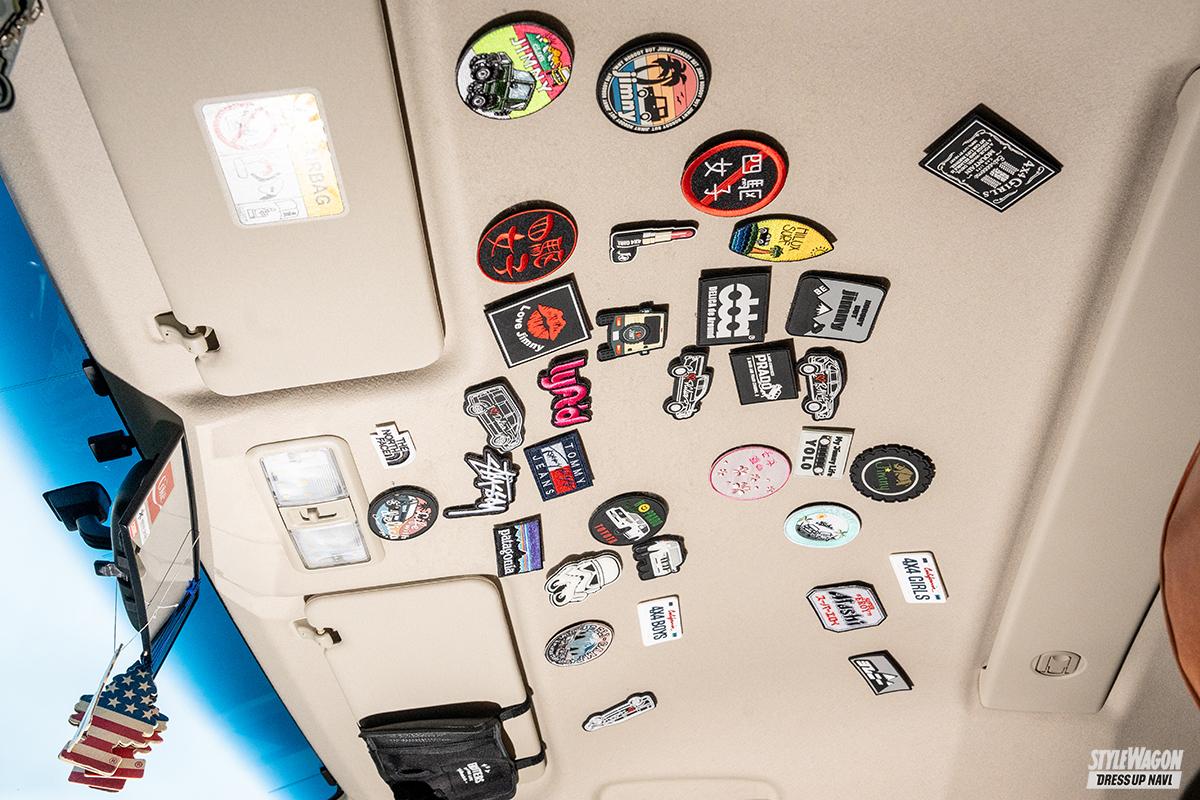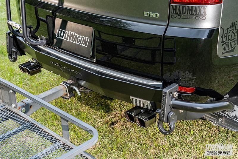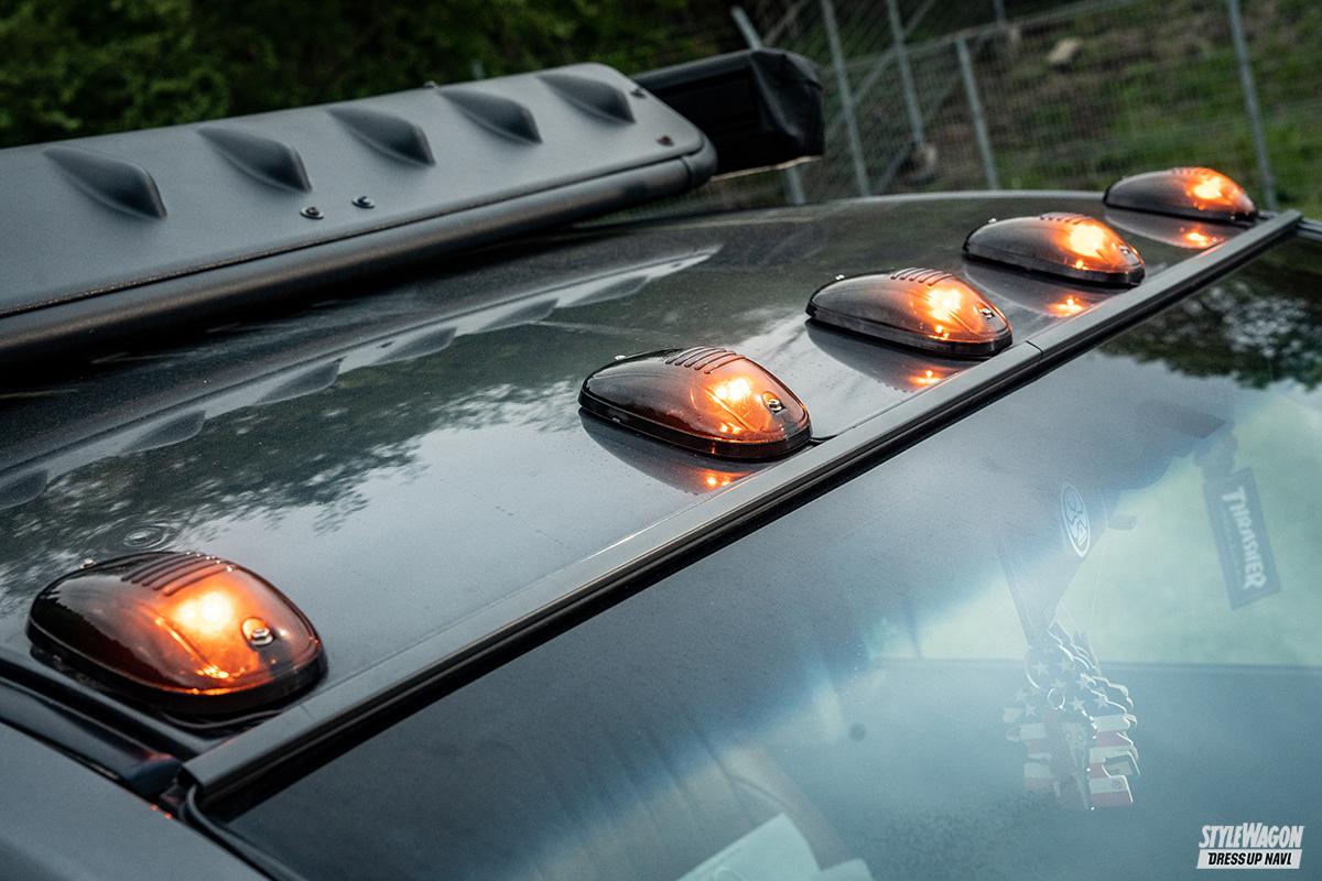 ポイントをザッと挙げると、スキッドバーやラダー、ラックなどのスチール系を筆頭に、各所に追加した灯火類など多数。自慢の車高は、ブロック+タイヤ外径差でアゲた3インチリフトだ。ライトをスモーク塗装したり、各部をザラッとしたチッピング塗装で味付けしたりと、純正との違いは随所にあり。例えばフロントの追加フォグは、横への間延び感が強調されるとして、あえて搭載位置を中央寄りに変更したりと、単に付けるだけではないこだわりが見え隠れする。