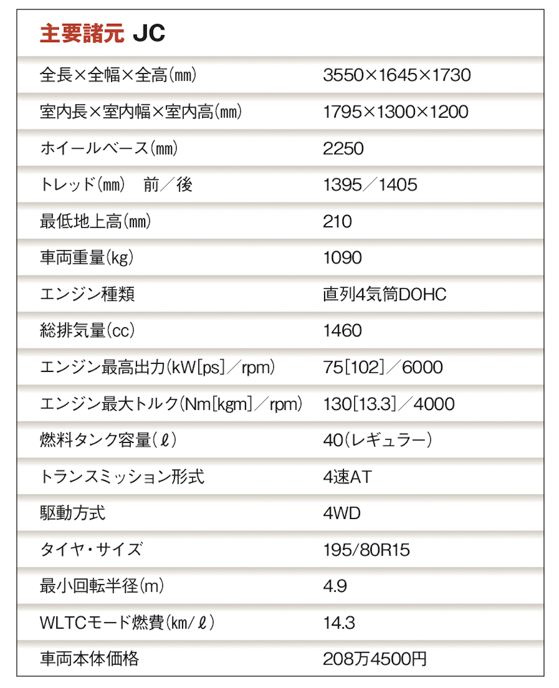 コンパクトなSUVとしては、乗り心地も快適だ。足まわりが柔軟に伸縮して、指定空気圧は前後輪とも180kPaに抑えた。最近のコンパクトな乗用車では、燃費向上のために指定空気圧を230kPa以上に高める場合もあるが、ジムニーシエラは柔軟に感じる。その代わりWLTCモード燃費は、4速ATの場合、14.3kmとあまり良くない。軽自動車のジムニーも同じ数値だ。