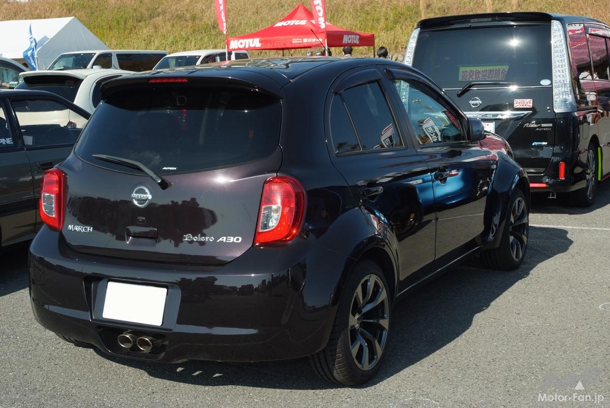 マーチといえばクラシックテイストが流行した際にラインナップされたボレロの姿もあった。特にオーバーフェンダーによるド派手な外観が印象的なK13型の30周年記念車、ボレロA30が7台も参加していた。