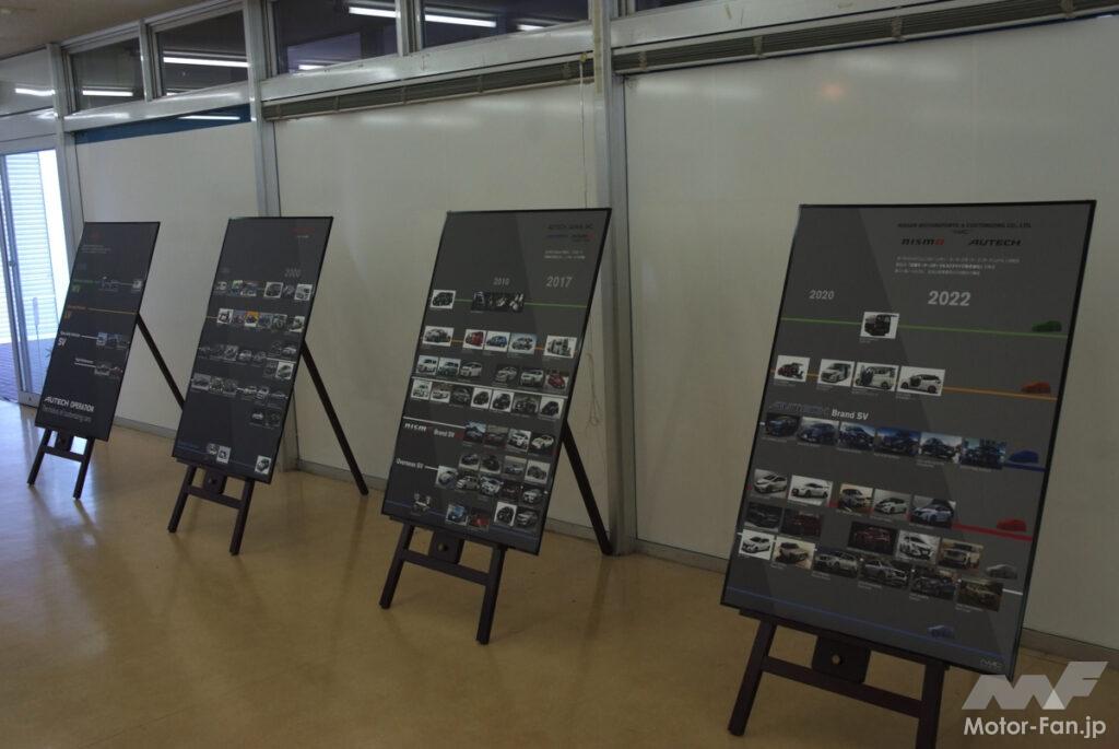 屋内では、話題となった伊藤かずえさんが所有するシーマのレストア記録や、NMC(その前身であるオーテックジャパンとニスモ)のヒストリーを代表車種と共に紹介するパネルが展示された。