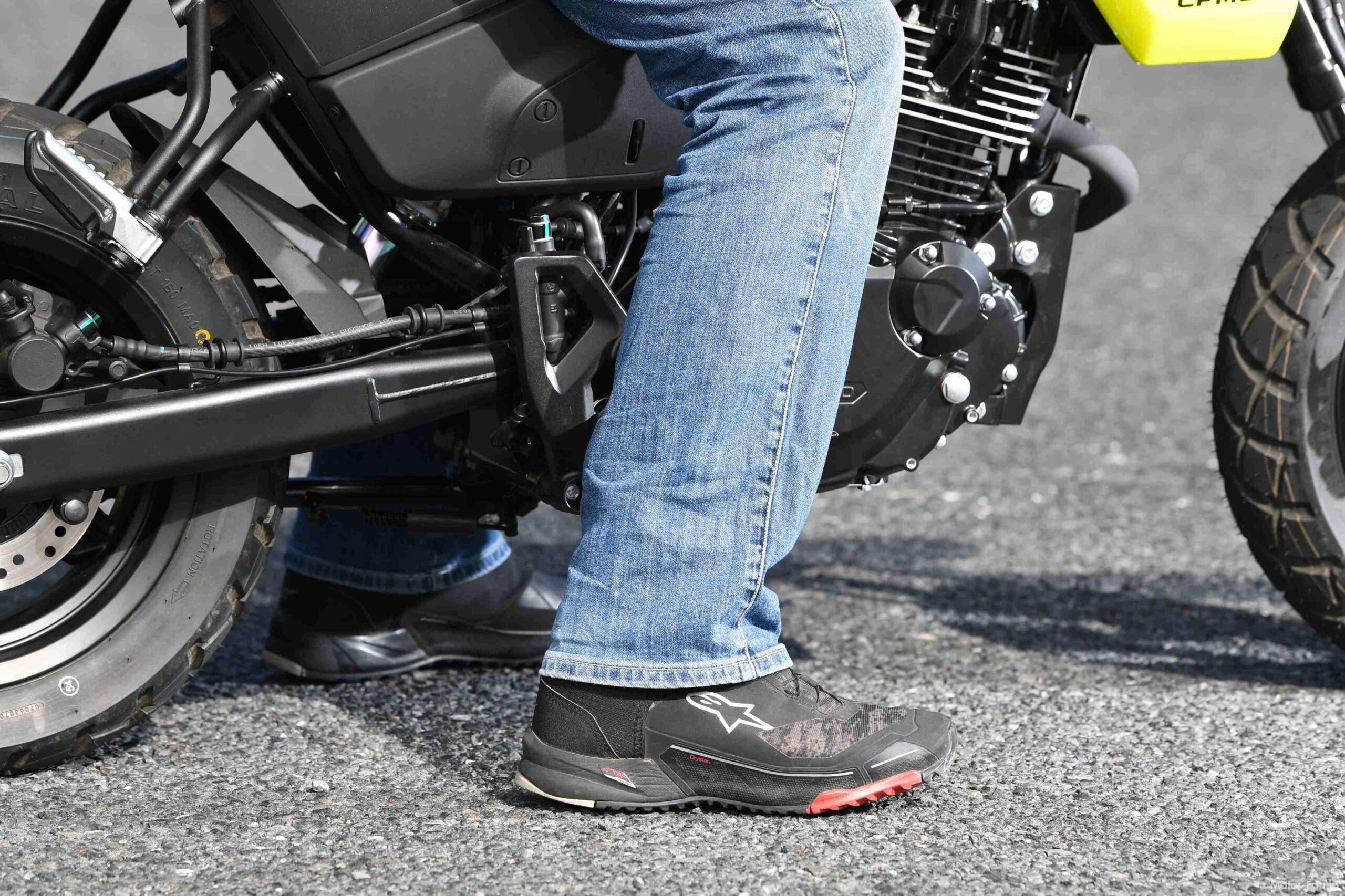 740mmというシート高は兄弟車のXO-1と同じでも、上半身が直立しているうえにシート形状が異なるからだろうか、足つき性はXO-2のほうが良好(身長が170cm前後なら余裕でカカトがベッタリ)。なおステップが前方に設置されているので、XO-2はヒザと足首の曲がりが穏やか。