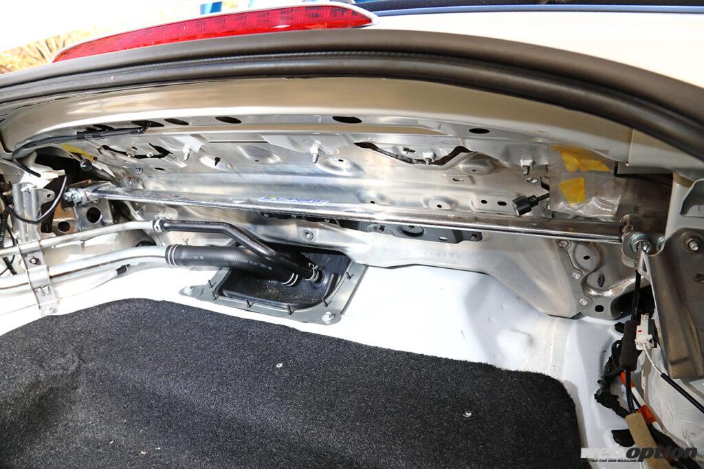 もちろん、リヤ用のタワーバー(リヤ タイプDアルミ:5万2250円)も用意されている。左右のリヤサスペンションの取り付け部をバーで繋げることで、コーナリング時のねじれを解消し、トラクション性能を引き上げることが可能だ。雨天時には外すなど、セッティング要素のひとつにもなる。デモカーはドンガラ状態となっているが、内張りの一部を加工すれば、純正然とした装着もできる。