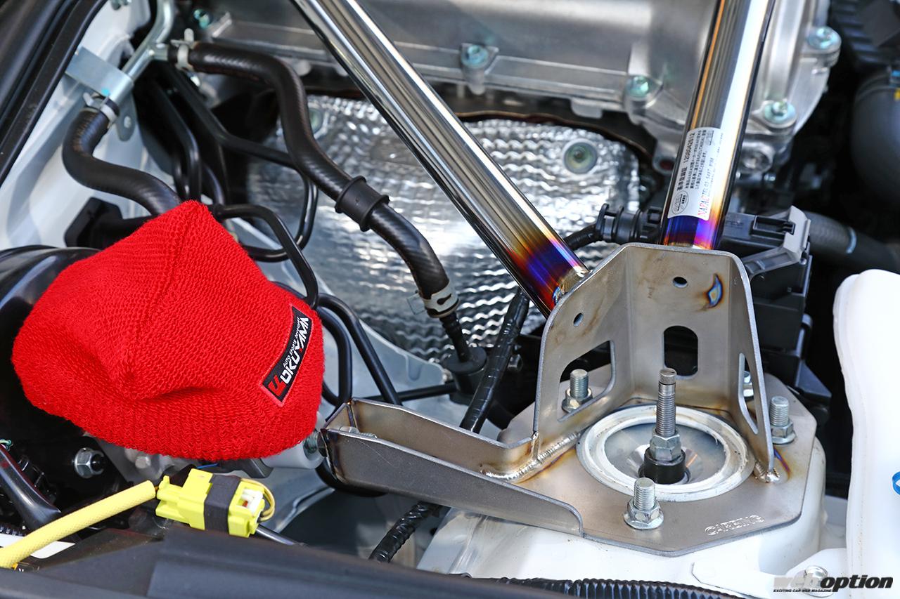 もちろん、リヤ用のタワーバー(リヤ タイプDアルミ:5万2250円)も用意されている。左右のリヤサスペンションの取り付け部をバーで繋げることで、コーナリング時のねじれを解消し、トラクション性能を引き上げることが可能だ。雨天時には外すなど、セッティング要素のひとつにもなる。デモカーはドンガラ状態となっているが、内張りの一部を加工すれば、純正然とした装着もできる。