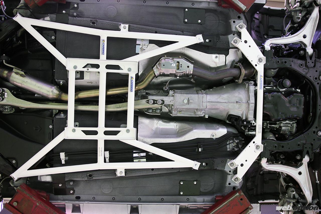 それに対応する製品は、フレームブレース・フロント(5万3130円)とフロアサブフレーム(9万2400円)。フロアトンネルに橋をかけるように補強することで、車体中心部のボディのねじれを予防する両アイテム。フロアサブフレームは中央部のバーまで付属するセット(11万880円)も用意する。もちろんボルトオンだ。