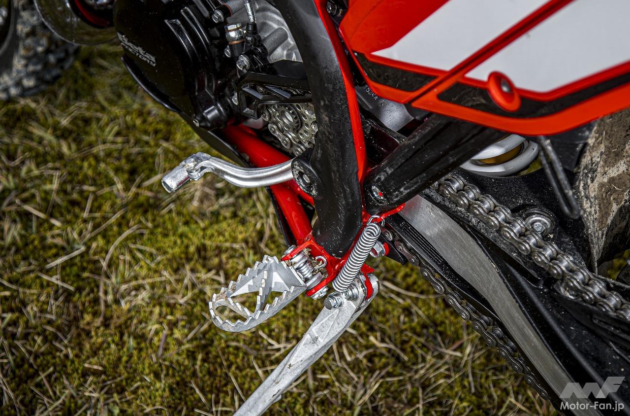 フットペグはRR2Tシリーズとは違った形状になっているが、とくに不満が出ることはなかった。シフトペダルとクランクケースに少し空間があるため、枝などを挟み込まないように気を使って乗ると良さそうだ。