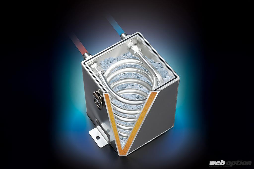 ボックスの内部はアルミパイプがスパイラル状に配されており、その周りに冷却材を充填して強制的に冷却を行う仕組み。ウレタンが封入された断熱効果の高いボックス構造と、表面積を稼げるスパイラル配管の相乗効果で、燃料温度を下げるわけだ。内部容量は3.0Lで、ドレン付きのため冷却材の排出も簡単に行える。1万9800円というリーズナブルな価格設定もポイントだ。
