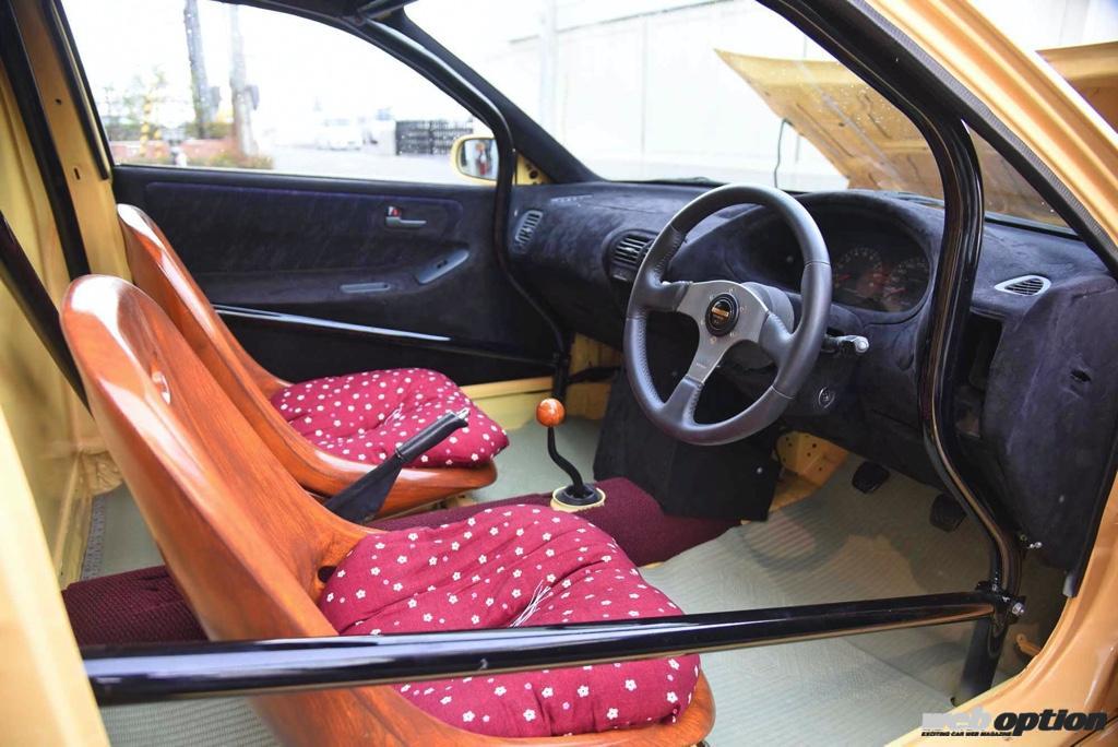 一方、インテリアに目を向けるとシートは木目調で、カーペット部にゴザを使用するなど「和風」テイストで製作。それでいてダッシュボードやドア内張りはスウェードに張り替えられ、ロールケージまで装着されるというスポーツ仕様となっている。