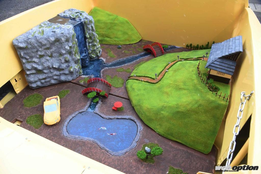 そして学生魂の集大成!?となるのが、荷台に再現された「古き良き日本の風景」ジオラマ。庭園にはINTE TRACKのミニチュアが佇み、池には錦鯉が…。滝から流れ込んできた川のせせらぎを聞きながら、夕方にはカラスが“かぁかぁ~”と鳴いていそうな癒しの空間である。これらは、レジンや粘土、発泡スチロール、絵の具など使って製作したそうだ。