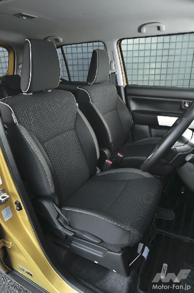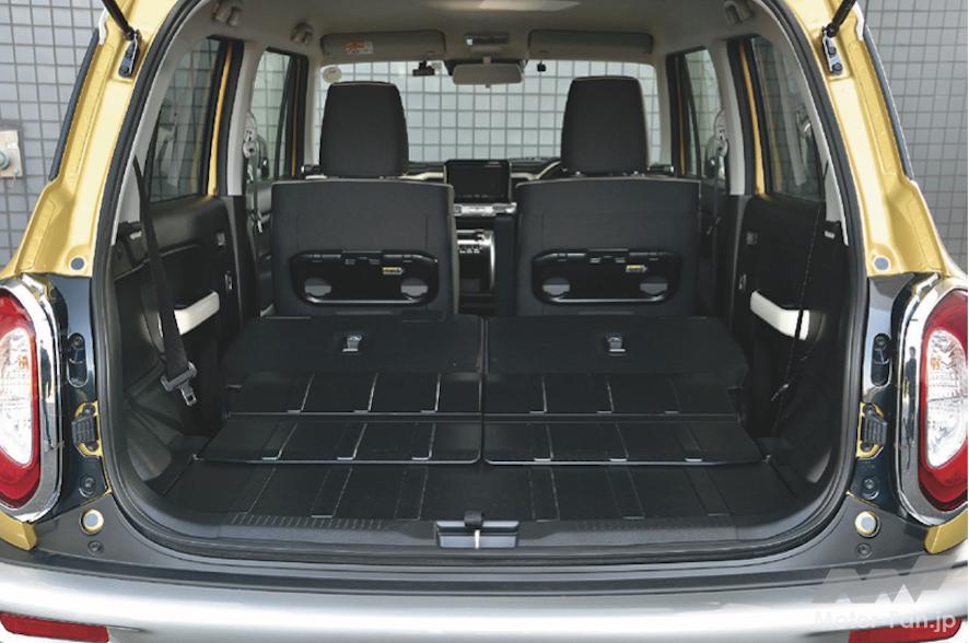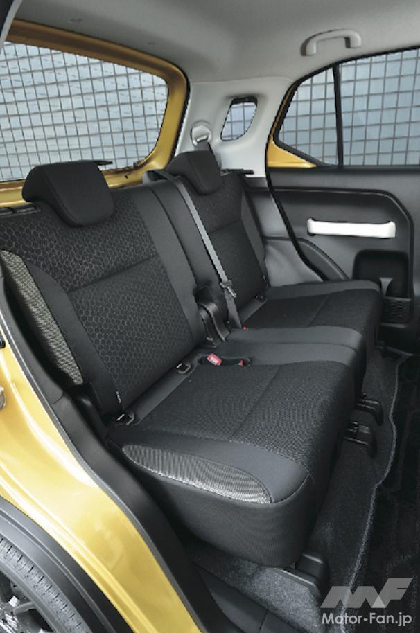 撥水加工シートも用意するインテリアは遊び心あるデザインで、イグニスに対して前席で60mm、想定外に足元広々の後席で50mm高い着座位置となり、SUVらしい視界が特徴的。トグルスイッチ類のメカニカル感もなかなかだ。防汚タイプの荷室は35lのキャリーケース5個を飲み込む広さ。アウトドアの荷物も余裕で積み込めるはずである。