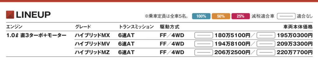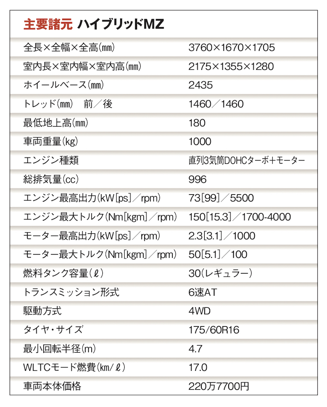 全幅が1670mmとナローに抑えられているのも使いやすさ、走りやすさに貢献する。パワーユニットは1.0l3気筒ターボで全車ともにモーターを加えたマイルドハイブリッド車となる。FFとフルタイム4WDを揃え、最低地上高は180mmとなかなか本格的。