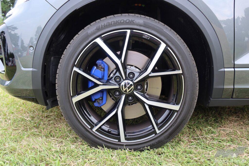 まずは車両概要から整理していこう。T-Roc Rの全長×全幅×全高は4245mm×1825mm×1570mmで、T-Rocより全高が20mm低い以外は同じ。大きく異なるイメージを漂わせる理由は、迫力ある専用のフロントバンパーと、T-Rocより2〜3インチ大径の19インチアルミホイールにある。開口面積の大きなホイールから覗く、ブルーにペイントされたブレーキキャリパーがアクセントになっている。