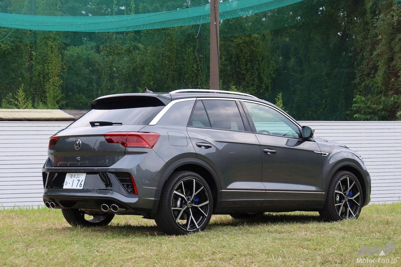 リヤも専用のバンパーを装備。その下にある左右2本ずつのテールパイプが、後続車に高いパフォーマンスの持ち主であることを訴え掛ける。細かいところでは、リヤのナンバープレート上にあるロゴがT-Rocと異なる。T-Rocの場合はストレートに「T-ROC」の文字が並んでいるが、T-Roc Rの場合は「R」ひと文字だ。