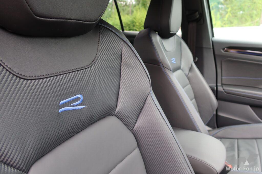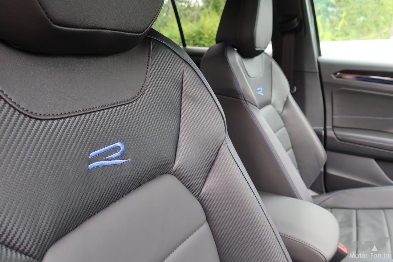シートはナパレザーの専用品で、シートバックにあしらわれた「R」のロゴがいいアクセントになっている。試乗車のボディカラーはインジウムグレーメタリックだったので対象外だが、ラピスブルーメタリックを選択するとダッシュパッドもラピスブルーになり、エクステリアとインテリアのカラーが同色でコーディネートされる。