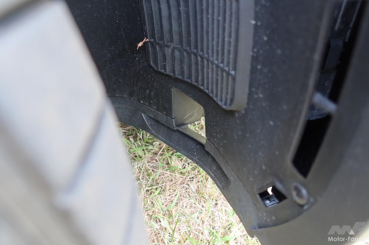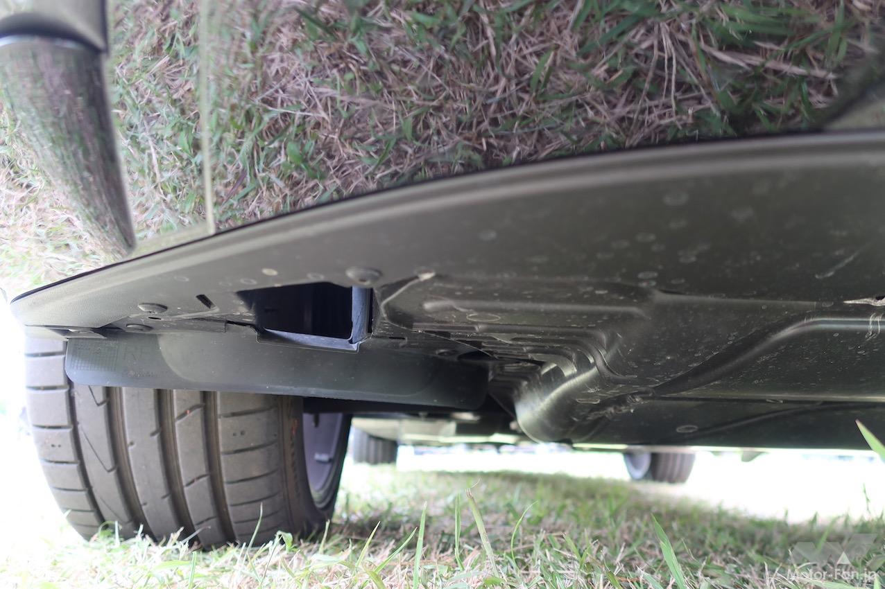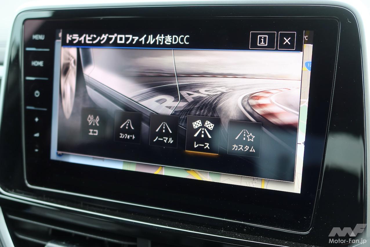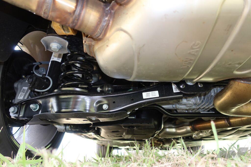 リヤバンパー下からリヤサスペンションまわりを覗き込んでみると、ダンパーの下部にソレノイドバルブで減衰力を調節する外付けバルブが確認できた。同時にMONROE(モンロー)のロゴを確認。走行モードを切り換えると、モード選択に応じ、パワートレーン(エンジン+DSG)や電動パワーステアリン、とダンパーの減衰力を切り換える仕組みだ。