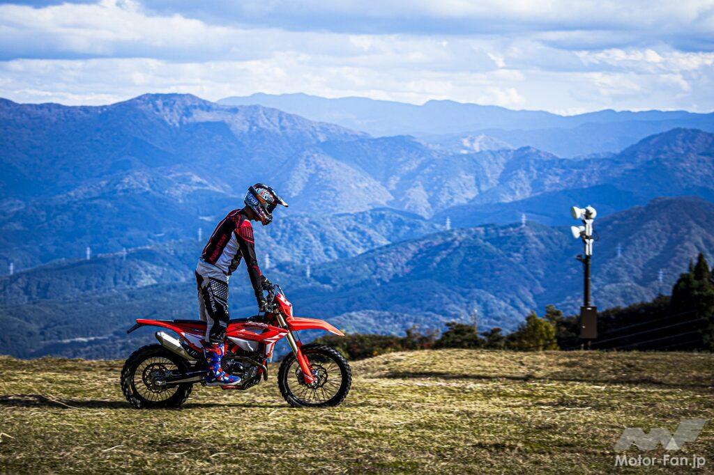 これは圧縮比を12.33:1と低めに留めているのが大きな要因だと思います。圧縮比の低さにより低回転でも粘り、エンストのしにくさにつながっているはずで、こういった部分はエンデューロにも適したエンジン特性ですね。ボア×ストロークはボア95mm、ストロークが60.8mmなので若干ショートストローク気味かな?と思ったのですが、圧縮比を落としているのも奏功しているのかもしれません。とても自然なフィーリングかつ、トルクもあるのでリヤタイヤをグリップさせやすく「アレ、乗るのが上手くなったんじゃない?」って錯覚してしまうほどでした(笑)。