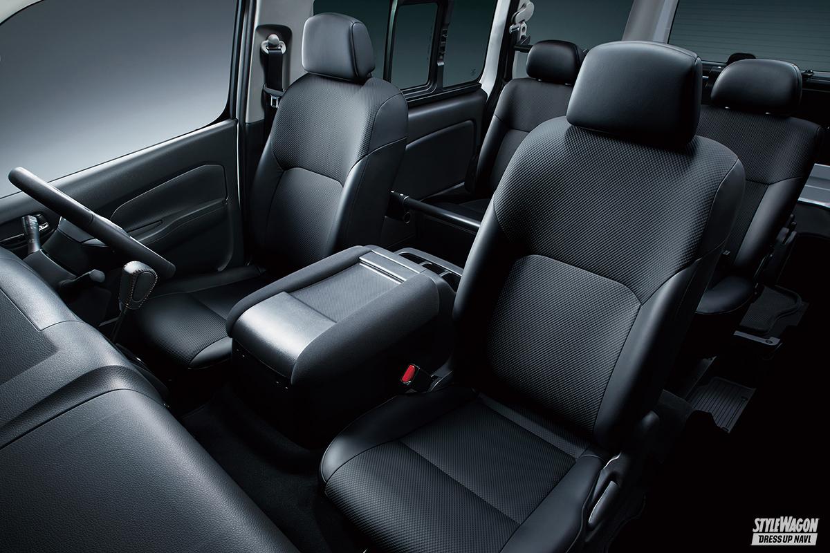 プロスタイル最大の特徴は防水シート。文字通り水を弾く特殊処理が施されたシートが標準となっており、海や山などのレジャーのほか、突然の雨でも気兼ねなく使える。そのほか15インチホイールとエンブレムが専用。リアルーフスポイラー(ウイング)はオプションだ。価格はベース車から約10万5000円高額となっている。