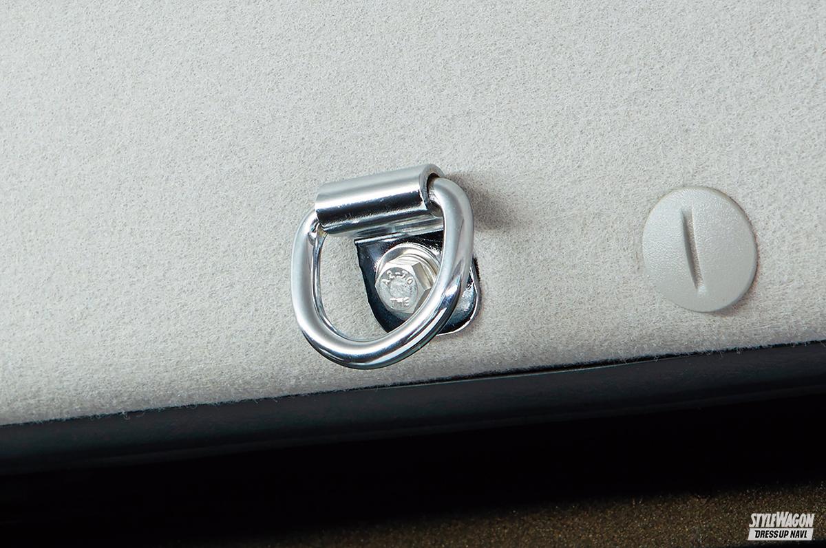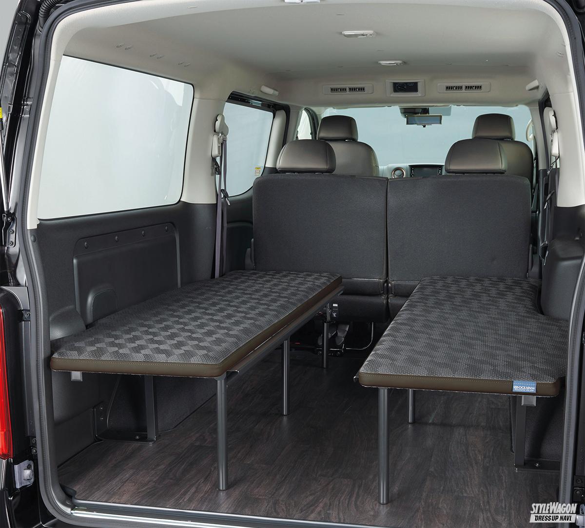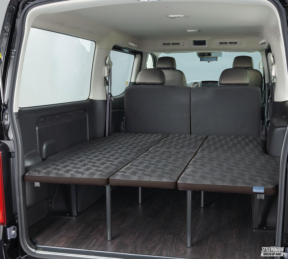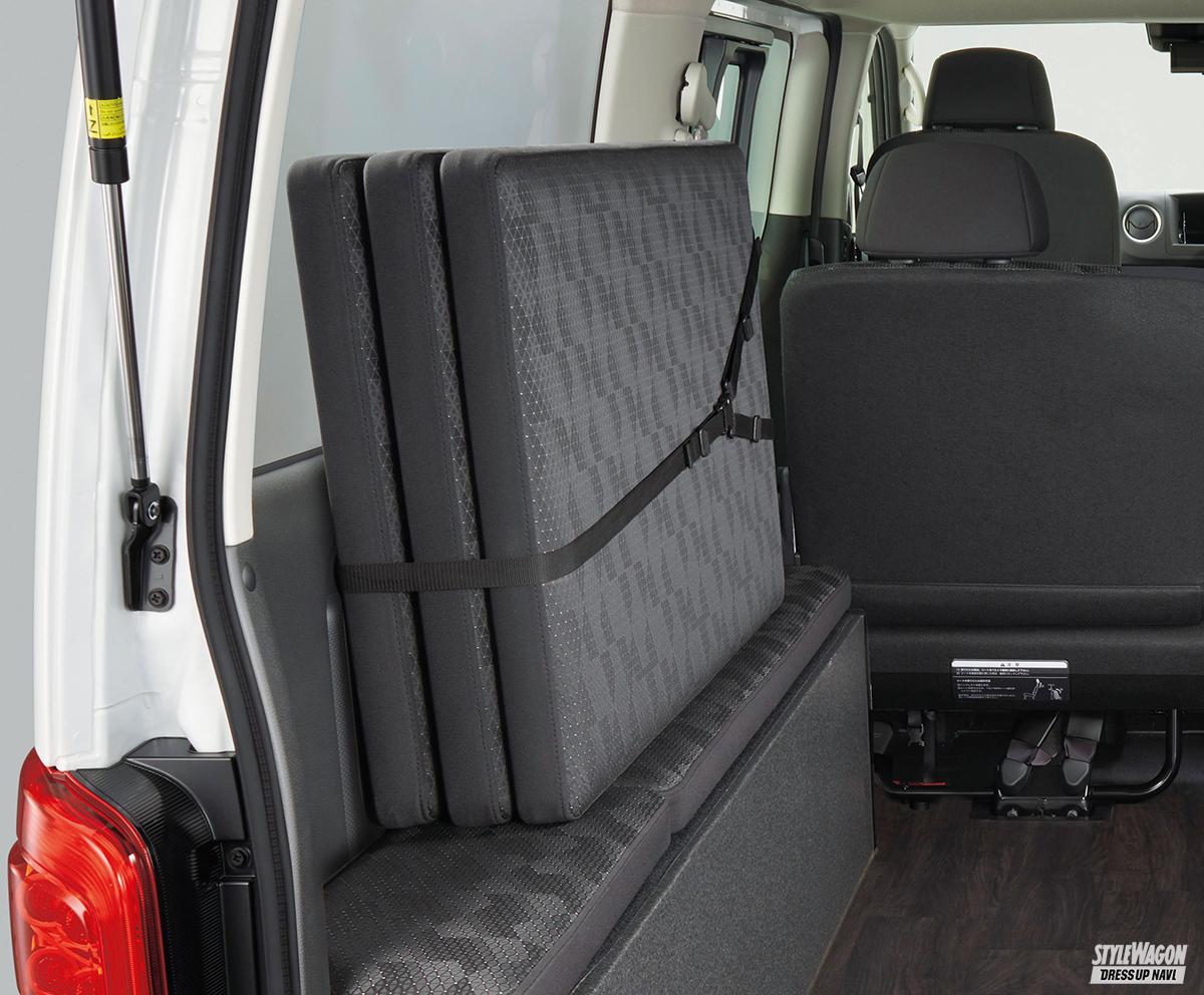 最大の特徴はフロア。モトクロスなどの重量物も積める特別な高耐久のフロアを採用。特殊構造による凹凸のない高い安定性も自慢で、撥水性も高いなどお手入れもカンタン。車中泊もできる、収納ボックス付きのベッドキット仕様でも購入可能。マットの脱着も楽勝だ。マットも専用。先述の「ベッドキット」が厚さ50㎜に対しこちらは60㎜。その分マット下の収納高が10㎜狭く340㎜となる。価格はベース車から約34万円高額。