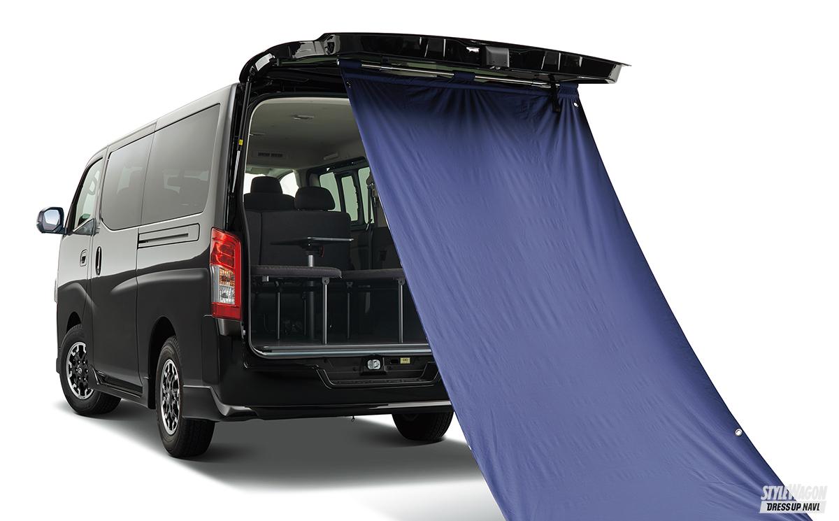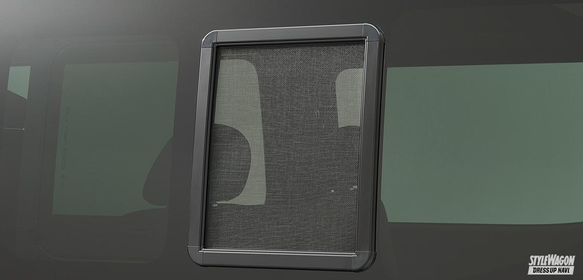 コンプリートの実用性を高める、あると便利なオプションもいろいろ。各種フック類の収納系から遠征先で使えるテントやタープ、プライバシー保護につながるウインドウパネル、さらに網戸なども!