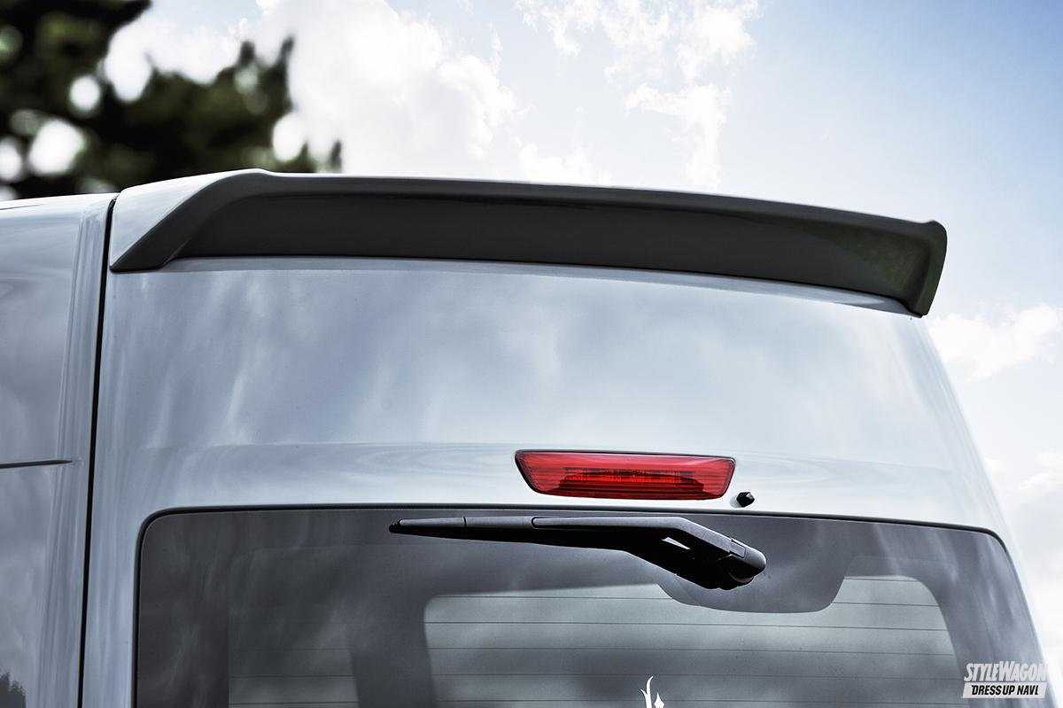 ボトムへの適度な張り出し持たせたフロントハーフ。ロアグリルから造形を与え、両端にはプレスラインのアクセントを加え今旬のスポーツ感を表現。純正の樹脂部分を隠しながら、迫力のマスクを打ち出すボンネットスポイラーも用意した。リアハーフは欧州車にも通じるプレミアムスポーティな雰囲気。排気の影響を受けないデザインが特徴的だ。この前後スポイラーとリンクする疾走感のあるプレスラインで魅せるサイドステップや、リアビューの存在感を高めるナローハイルーフスポイラーも今旬スポーティの構築に効果を発揮する。