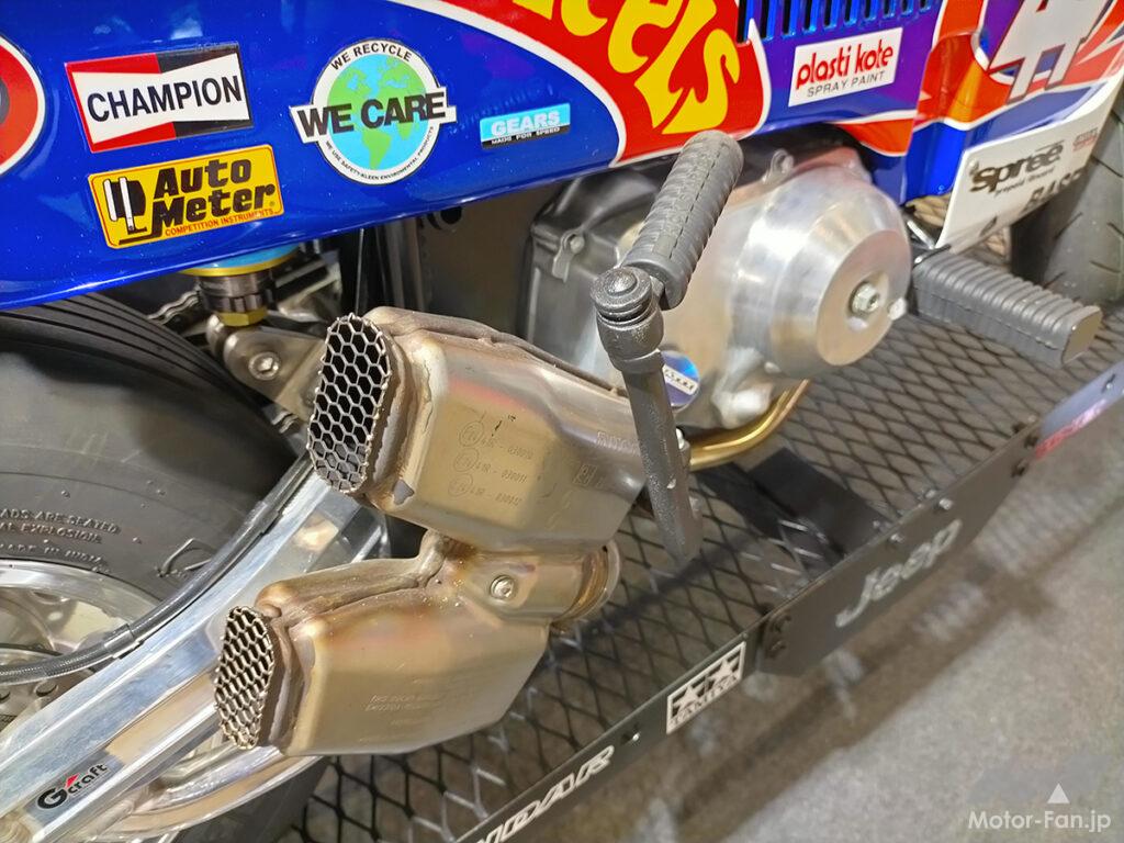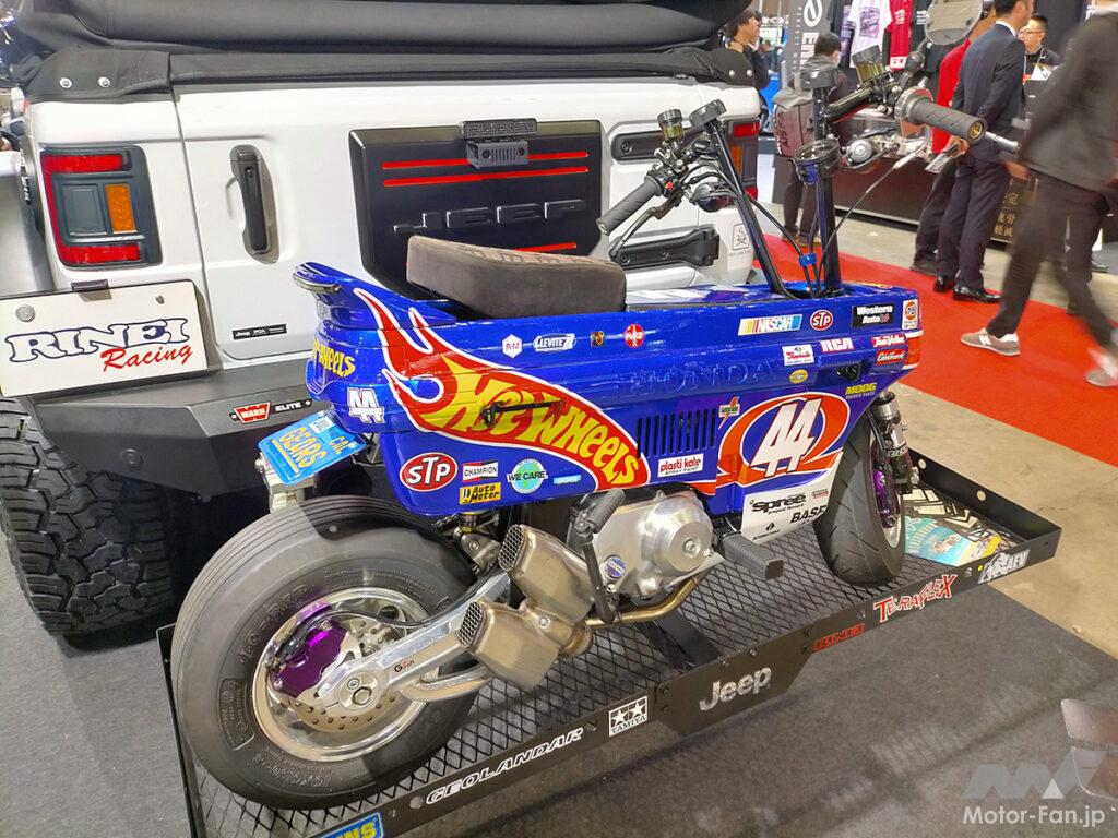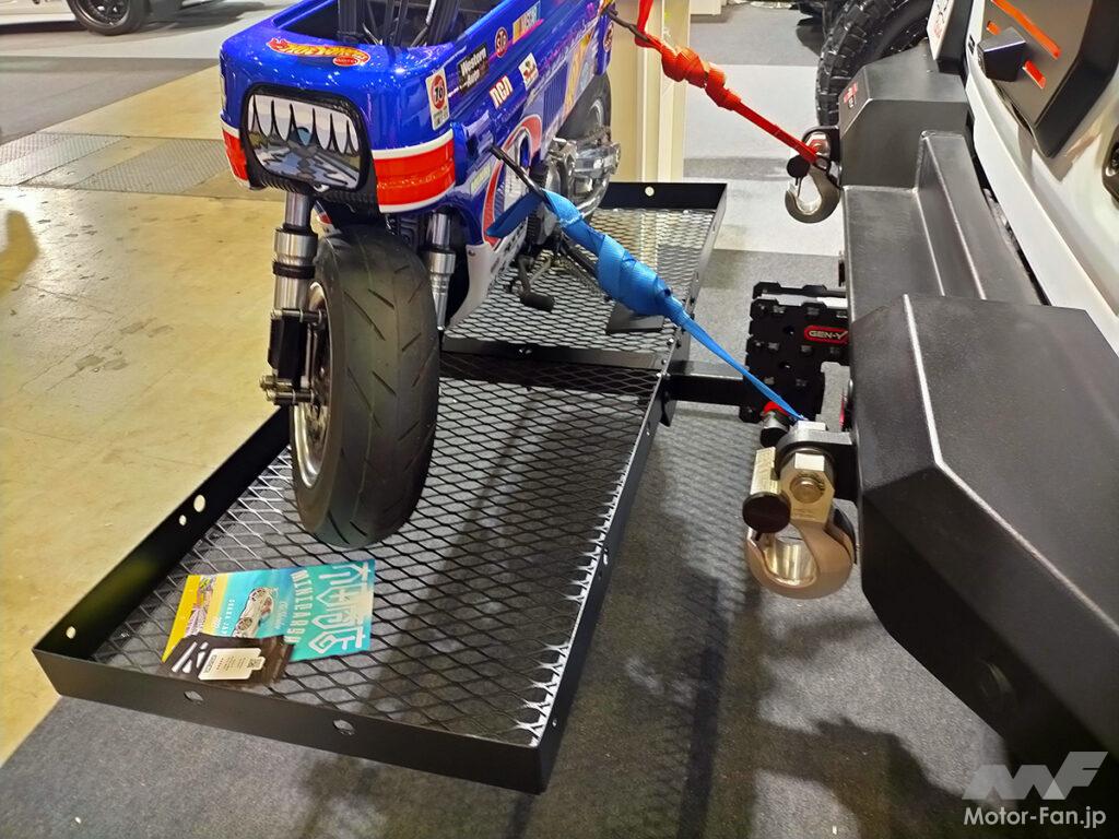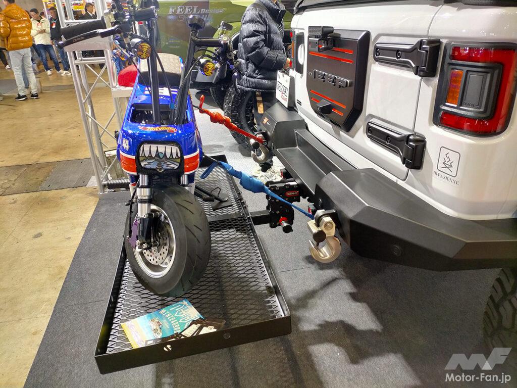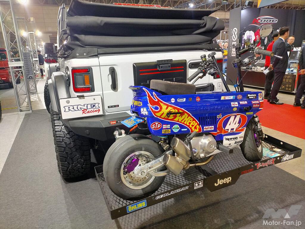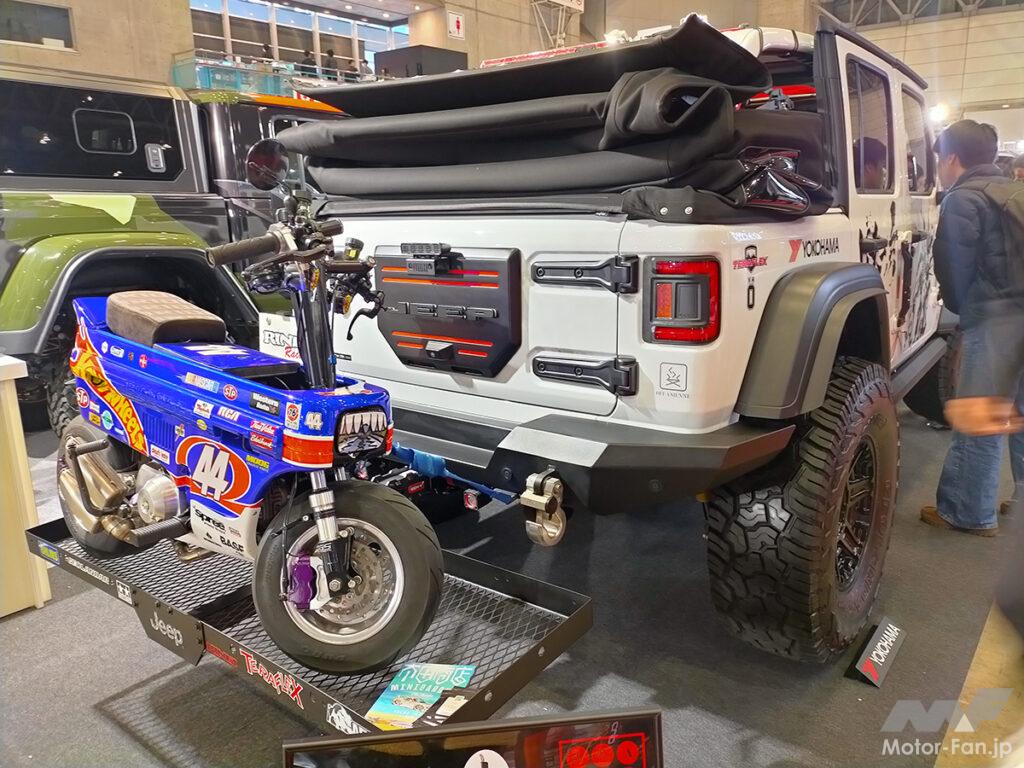 老舗の4駆専門店「RINEI」ブースに展示された写真のジープ・ラングラーは、カスタムショップ「OFFSIENNE(オフジェンヌ)」が製作した『SAMURAI WRANGLER(サムライ・ラングラー)』。後部には大型キャリアを装着し、カブエンジンを搭載したモトコンポ改を積載されている。